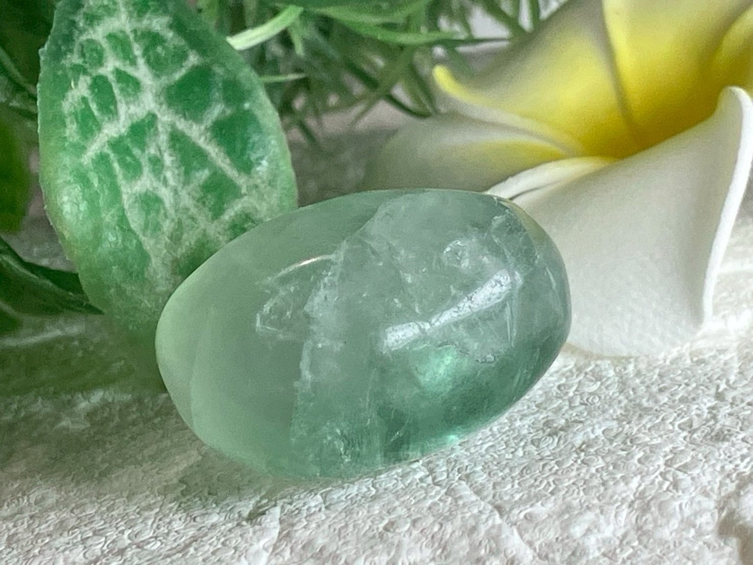 エメラルドグリーンに壮麗なレインボーが輝くフローライトのタンブルです❁⃘*.゜