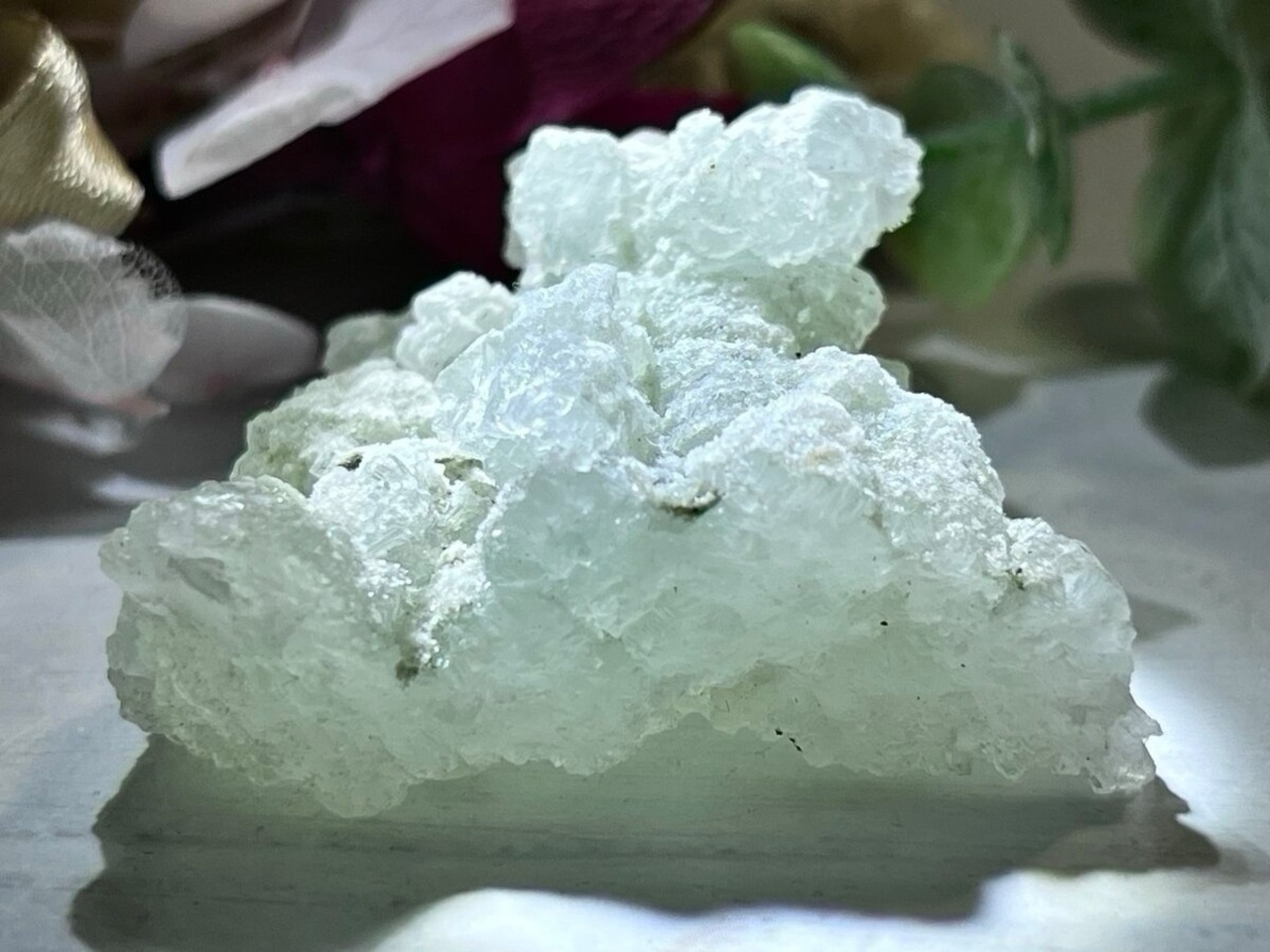 葡萄石とも呼ばれ、マスカットのようにぽこぽことした結晶型が可愛らしい原石。