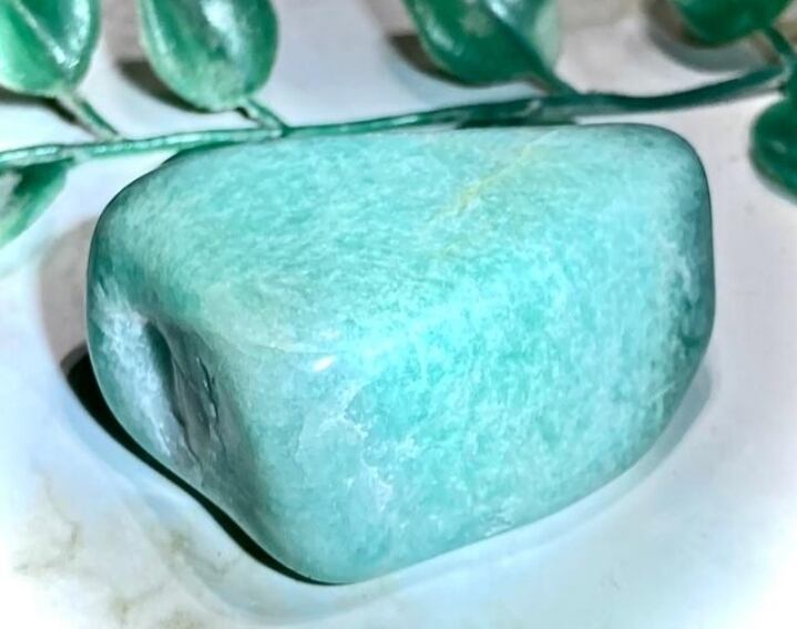 エメラルドグリーンが美しいアマゾナイト(天河石)のタンブルです。