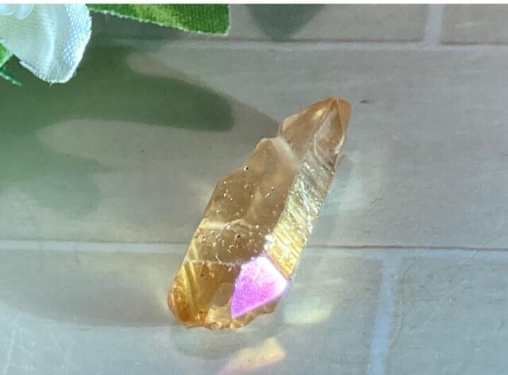 天然の水晶にイオン化した金属の蒸気を添加(蒸着)させた人工物になりますが、自然の物同士を錬金術的な組み合わせという事で、本来の水晶のパワーに上乗せし強化させてあると思われているようで、海外のヒーラーに好まれている石でもあります。