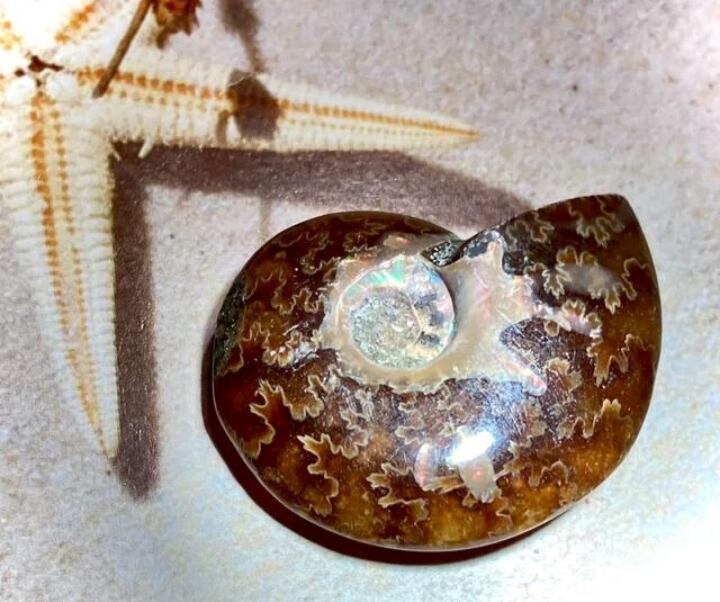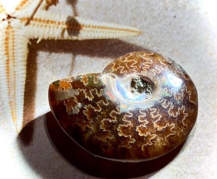 美しい七色の輝きを放つオパール化したアンモナイトの化石(虹入りアンモライト)です˚✧₊⁎