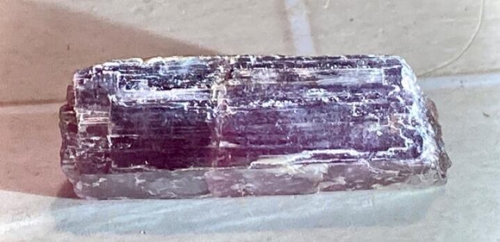 断面が光を受けて反射するパープルメタリック色のテラストーン・レピドライトです。