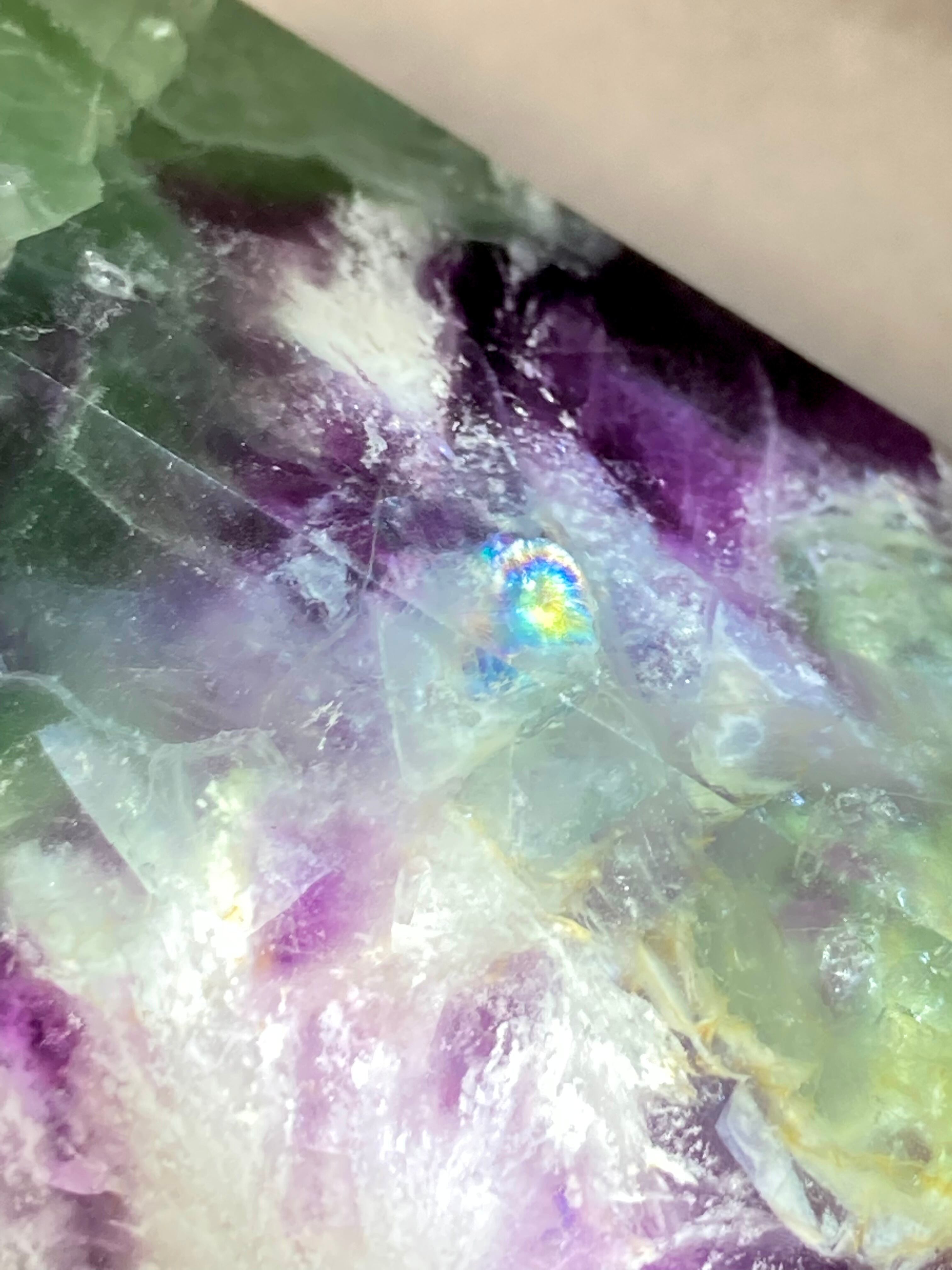 グリーン、パープル、ブルーの美しい色のフローライトの中に美しい虹の入ったインクルージョンの入ったフローライト✨