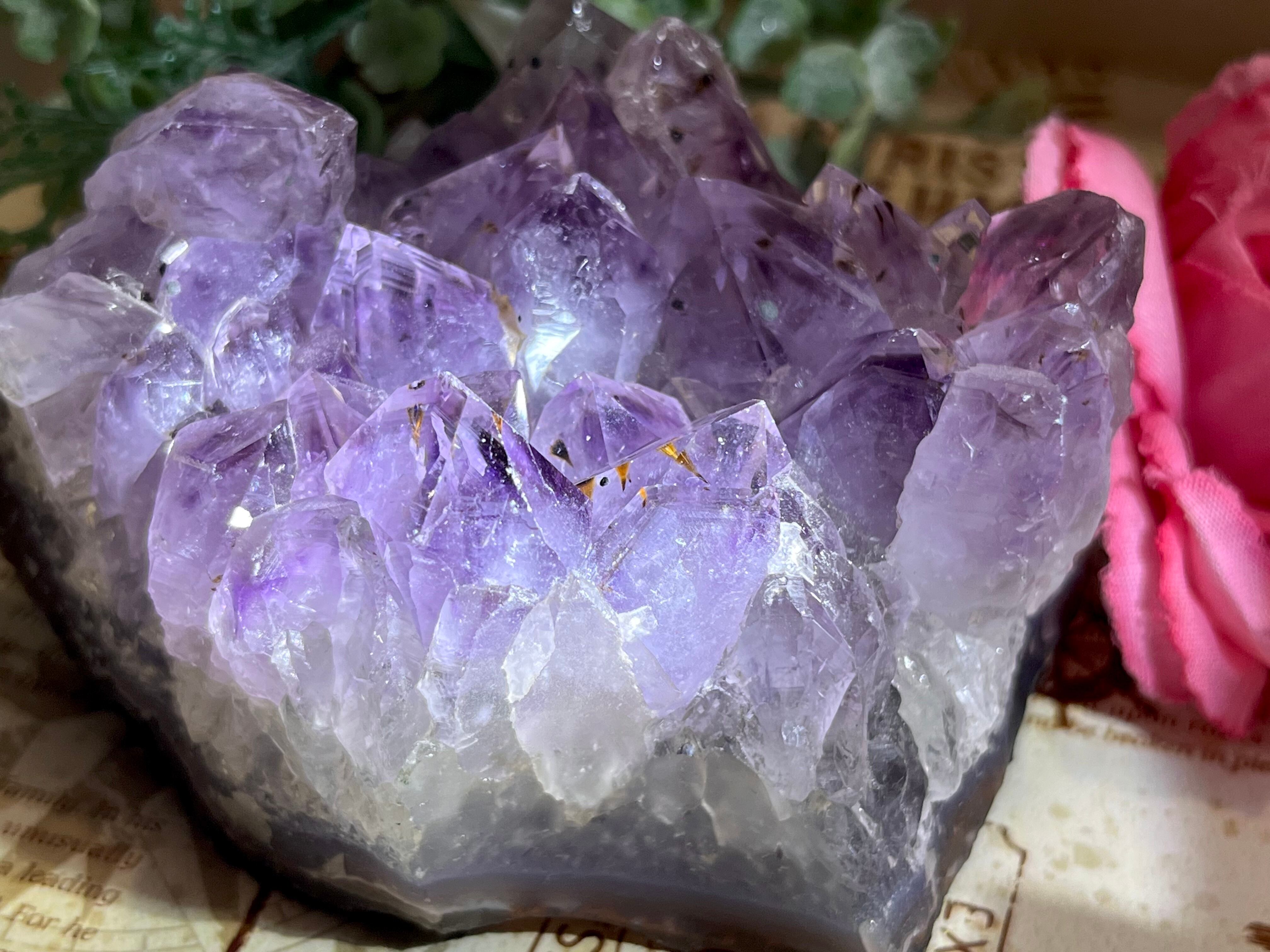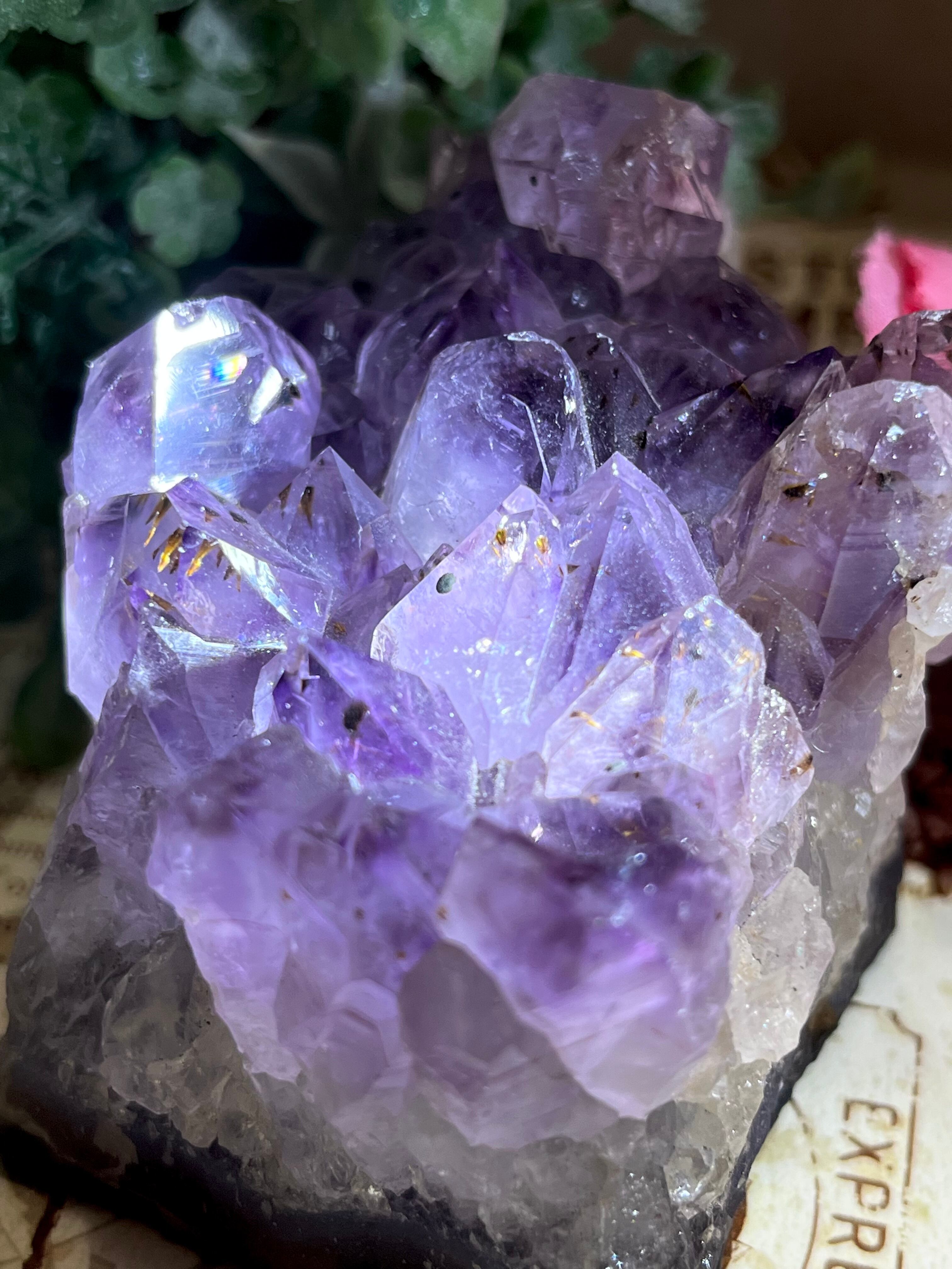 透明度が高く金糸のようなゲーサイトが内包されたアメジストのクラスターになります˚✧₊⁎