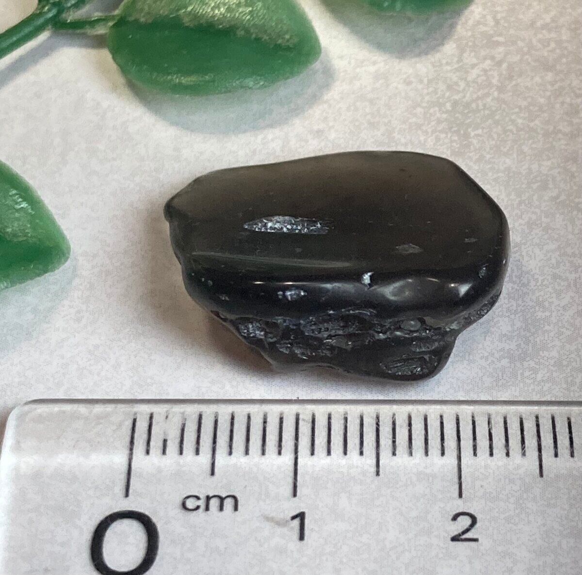 原石は黒く、全く光を通さないように思える見た目をしていますが、強い光を当てるとモルダバイトのように透かすことができます。