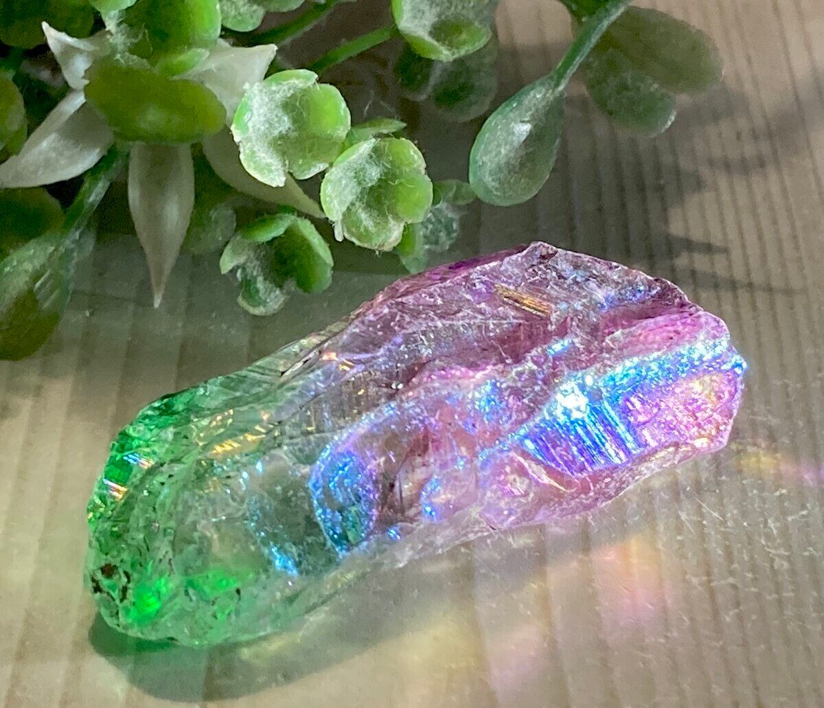 オーロラのような虹色をまとったピンクとグリーンのオーラ水晶ラフストーンです✿*:・