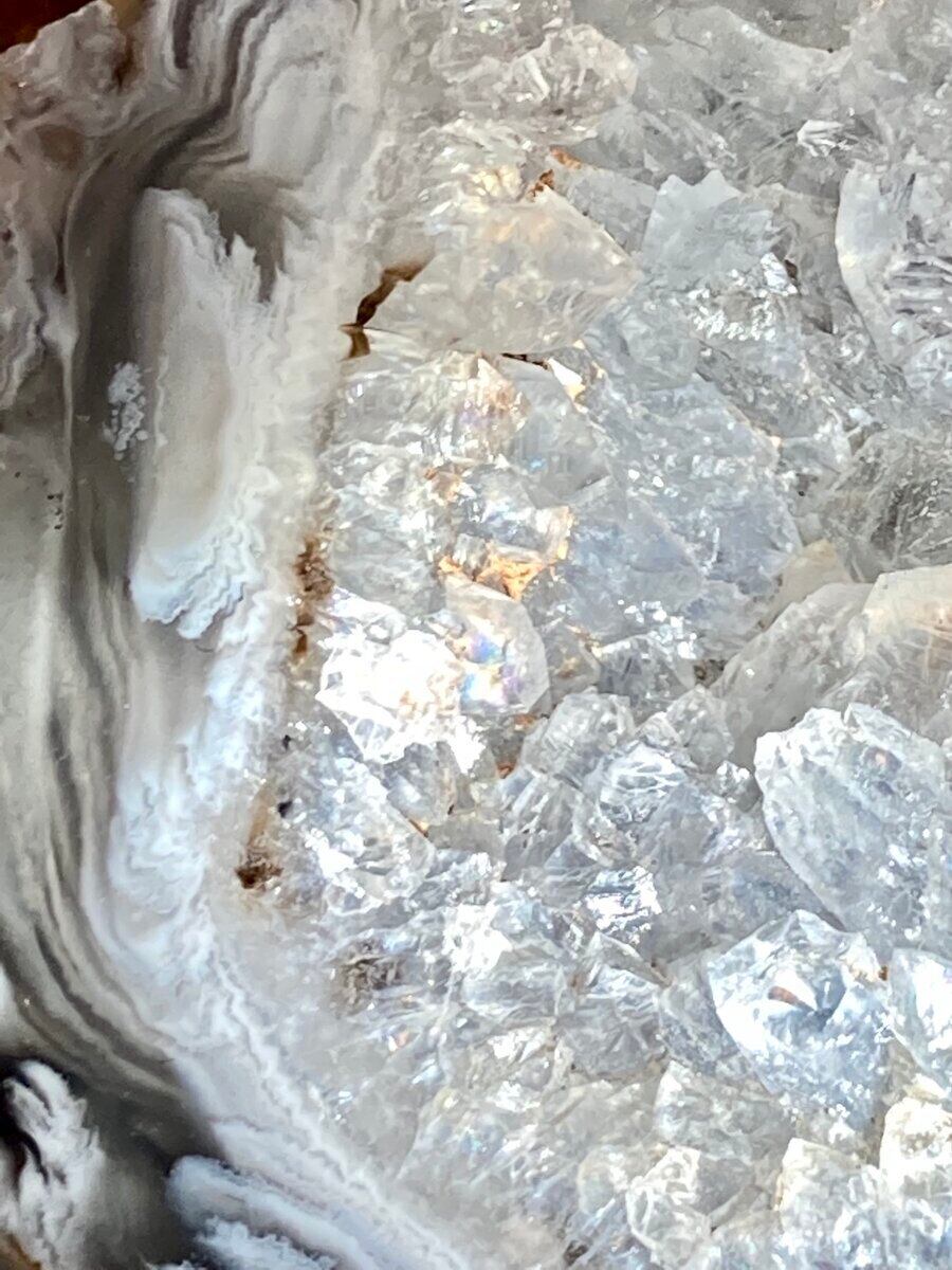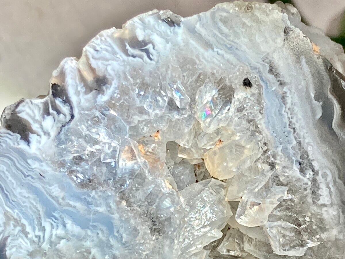 ライトを当てると結晶にレインボーが輝くレース瑪瑙(アゲート)のジオードになります(o^^o)