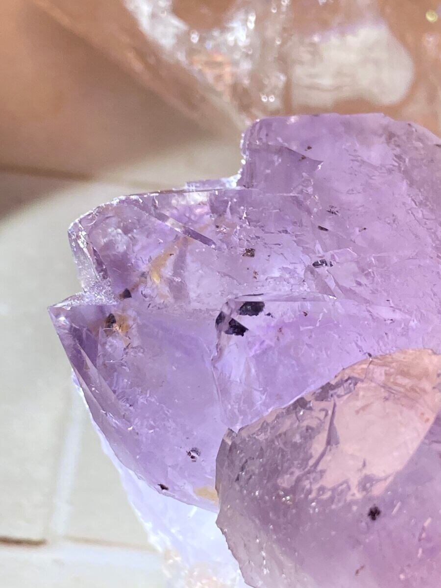 所々に金色や黒い光輝く斑点【ゲーサイト】が入っていて透明度も高く価値の高いアメジスト原石となります!