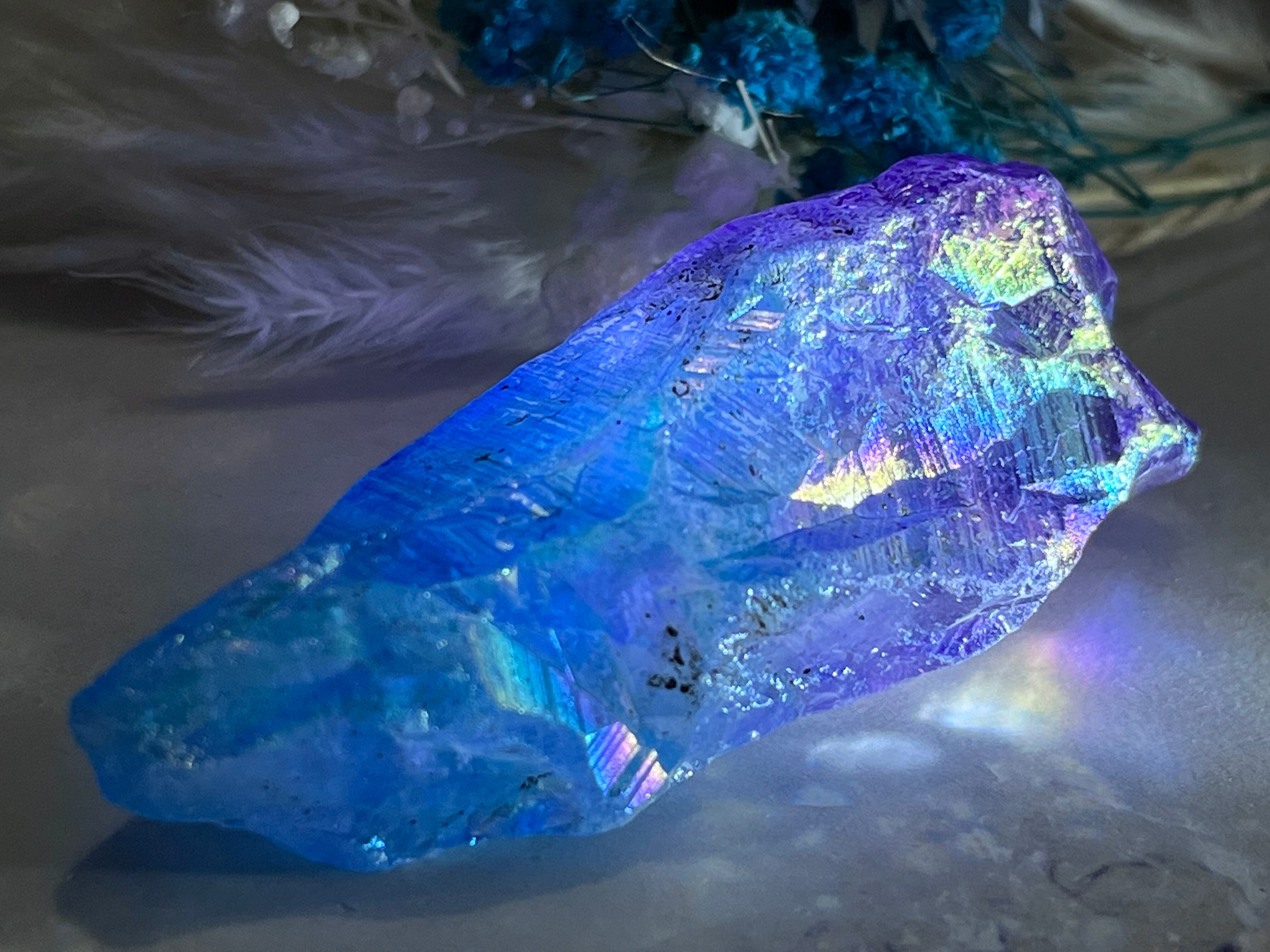 オーロラのような虹色をまとったブルーとパープルのオーラ水晶ラフストーンです✿*:・
