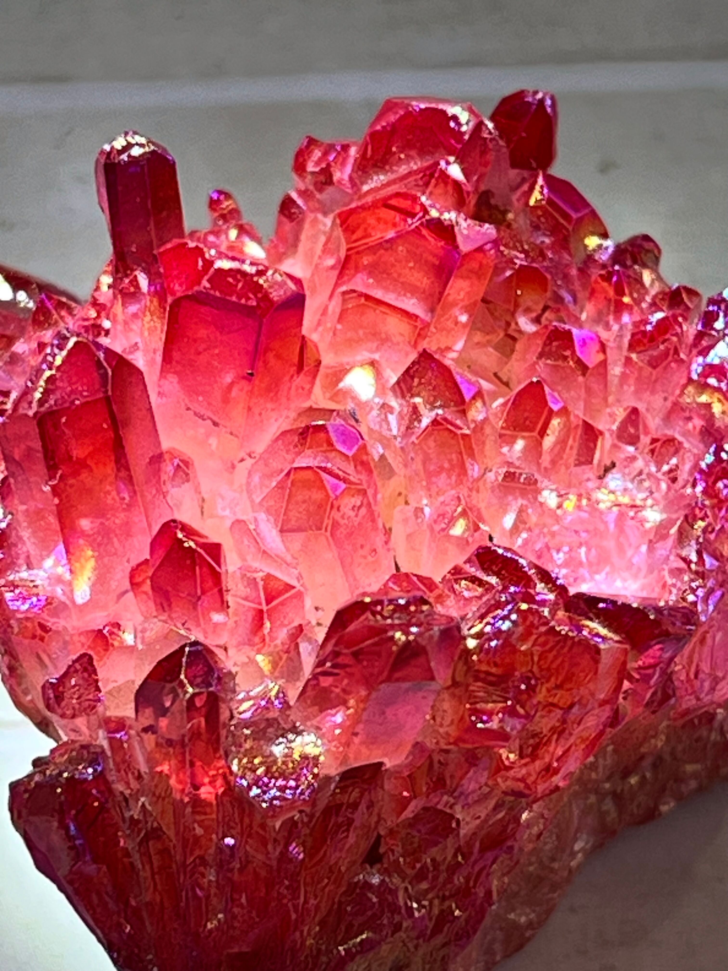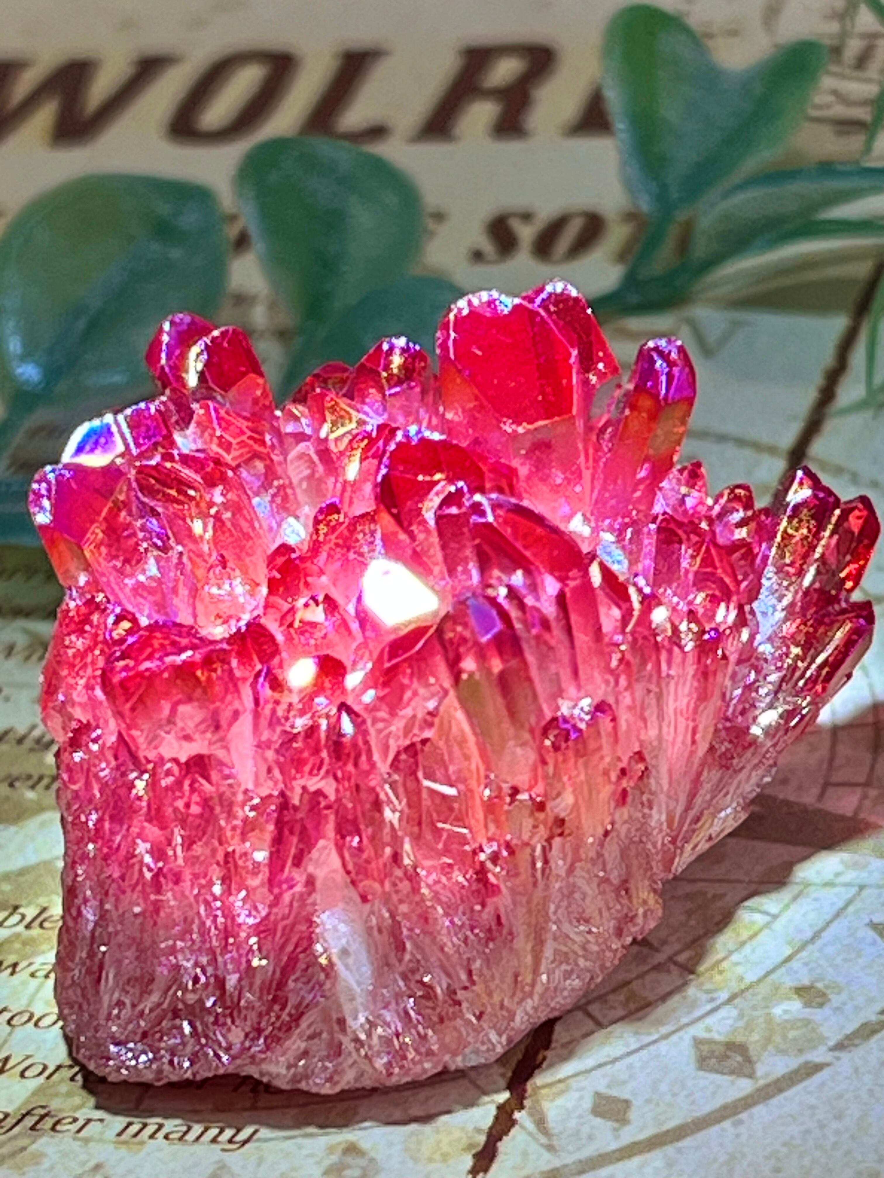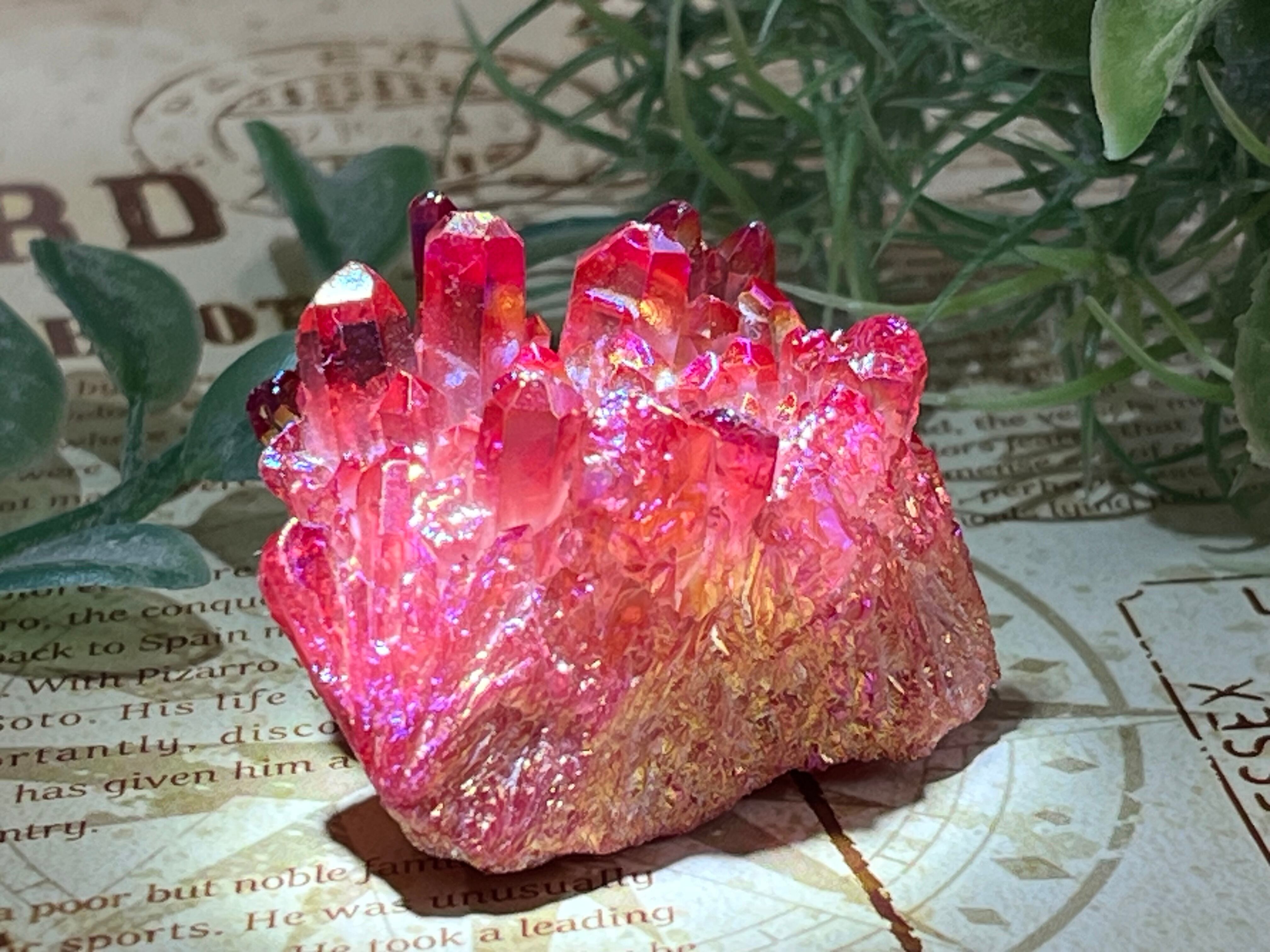 天然の水晶にイオン化した金属の蒸気を添加(蒸着)させた人工物になりますが、自然の物同士を錬金術的な組み合わせという事で、本来の水晶のパワーに上乗せし強化させてあると思われているようで、海外のヒーラーに好まれている石でもあります。