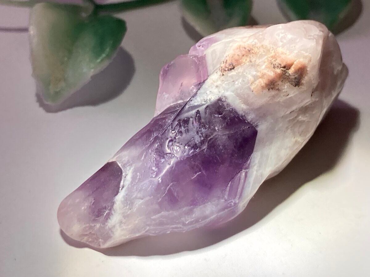 こちらは一部透明度の高い箇所がある珍しいシェブロンアメジストラフストーンです(*^_^*)