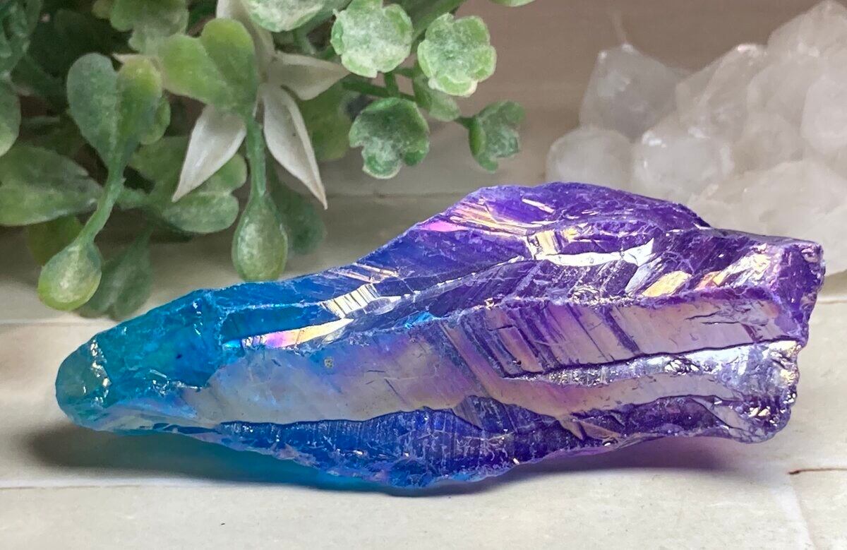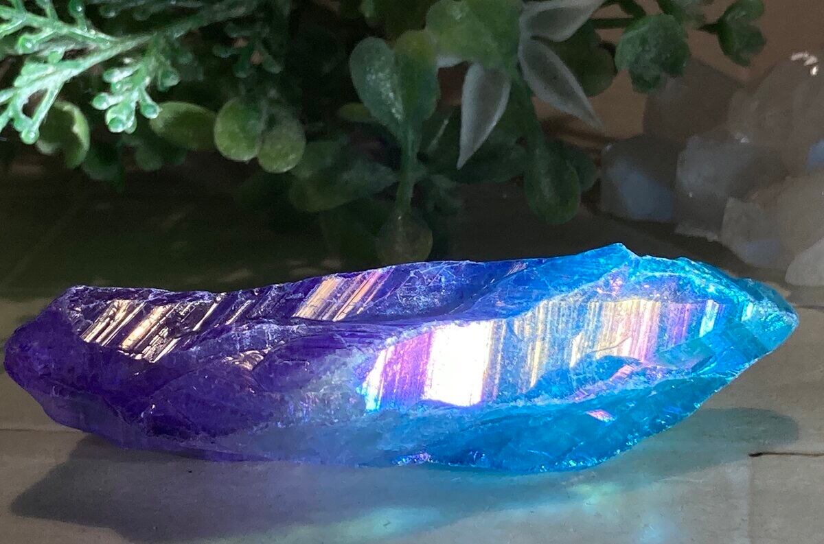 天然の水晶にイオン化した金属の蒸気を添加(蒸着)させた人工物になりますが、自然の物同士を錬金術的な組み合わせという事で、本来の水晶のパワーに上乗せし強化させてあると思われているようで、海外のヒーラーに好まれている石でもあります。