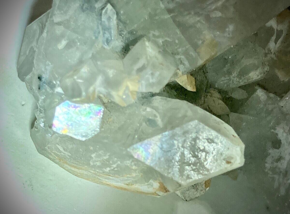 ライトを当てて幻想的な虹が現れるアポフィライトにスティルバイトが共生したクラスターです❁⃘*.゜
