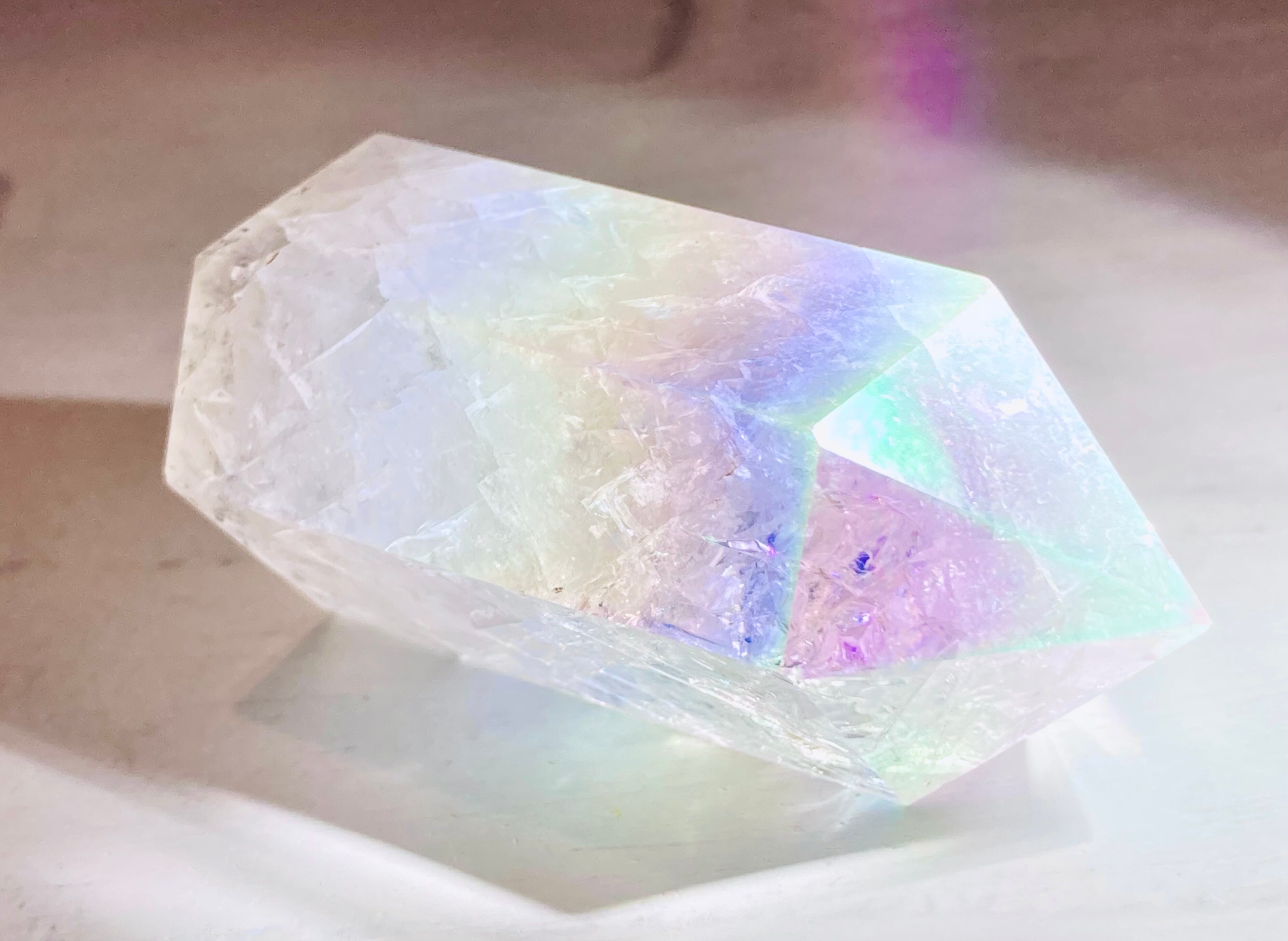 天然の水晶にイオン化した金属の蒸気を添加(蒸着)させた人工物になりますが、自然の物同士を錬金術的な組み合わせという事で、本来の水晶のパワーに上乗せし強化させてあると思われているようで、海外のヒーラーに好まれている石でもあります。