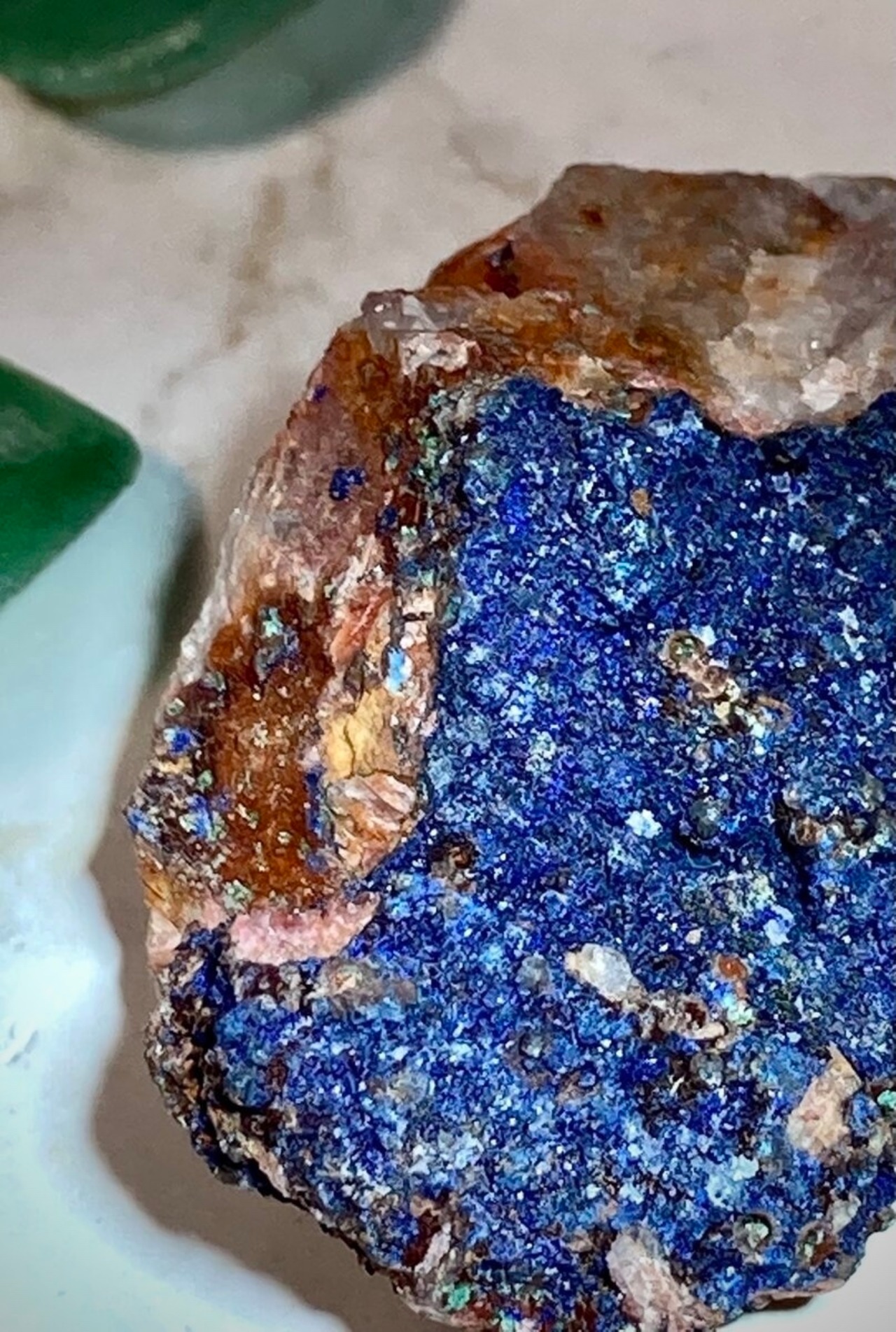 また、アズライトは中国とエジプト文明でも崇拝され、とりわけ中国では、「天の石」として知られています。両方の文明において、聖なる建造物の装飾に使われてきました。