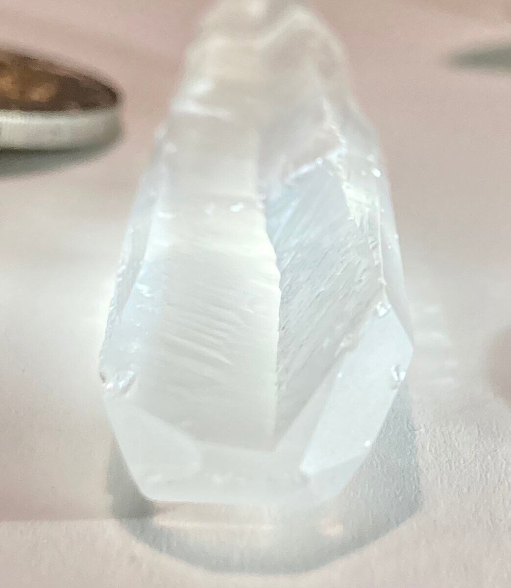 レムリアンシードクォーツには、柱面にバーコードのように見える横筋のリッジ(レムリアンリッジ)が入っており、同時にレコードキーパーと呼ばれる三角形の刻印が入っていることもあります。