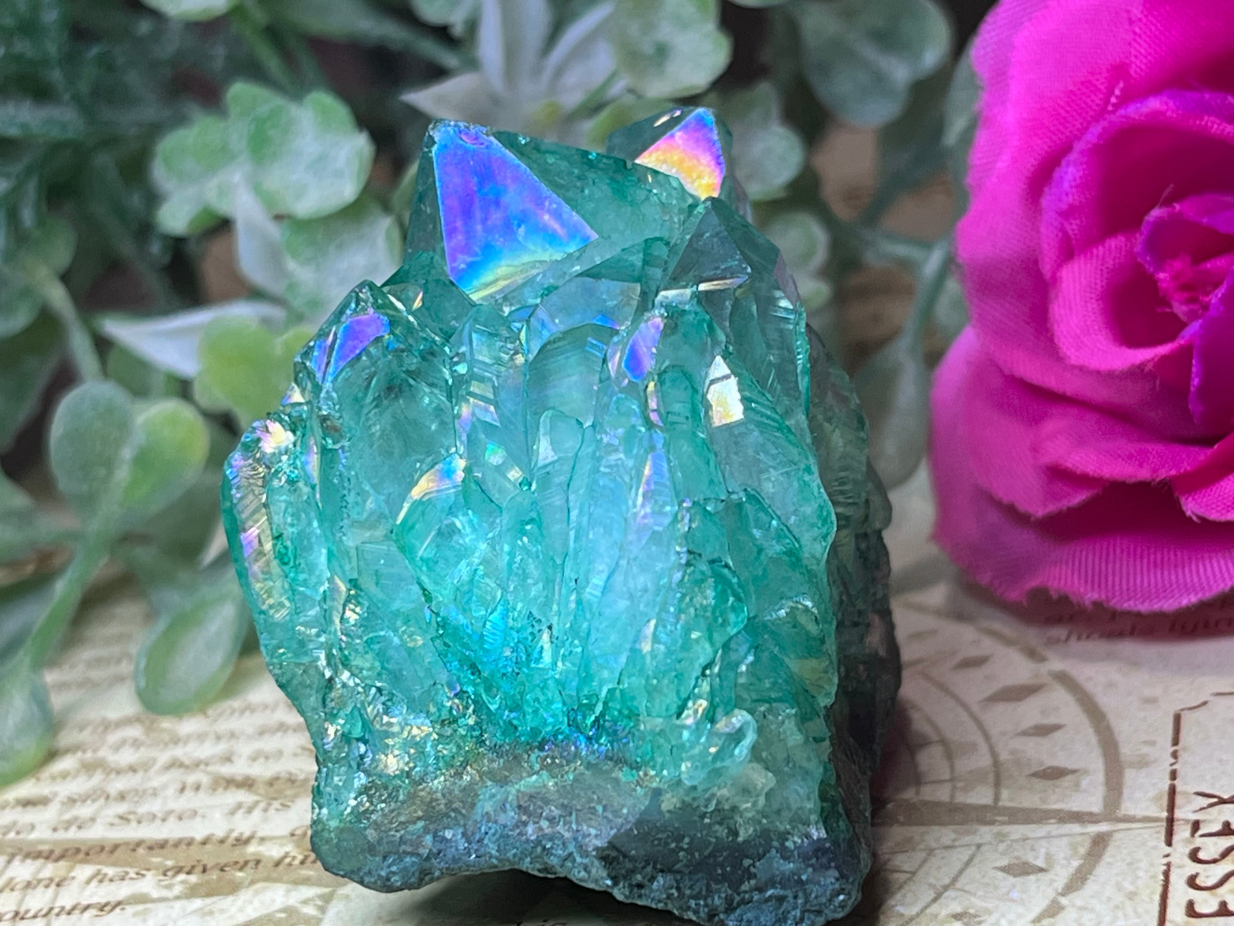 天然の水晶にイオン化した金属の蒸気を添加(蒸着)させた人工物になりますが、自然の物同士を錬金術的な組み合わせという事で、本来の水晶のパワーに上乗せし強化させてあると思われているようで、海外のヒーラーに好まれている石でもあります。