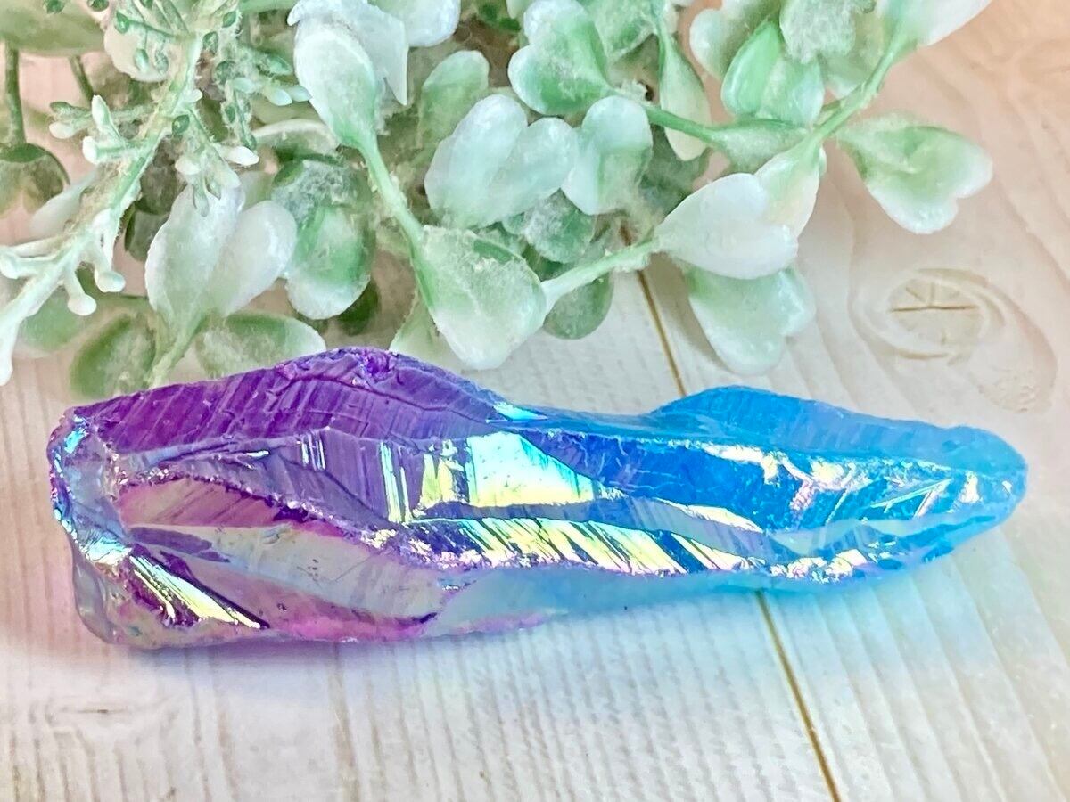 天然の水晶にイオン化した金属の蒸気を添加(蒸着)させた人工物になりますが、自然の物同士を錬金術的な組み合わせという事で、本来の水晶のパワーに上乗せし強化させてあると思われているようで、海外のヒーラーに好まれている石でもあります。