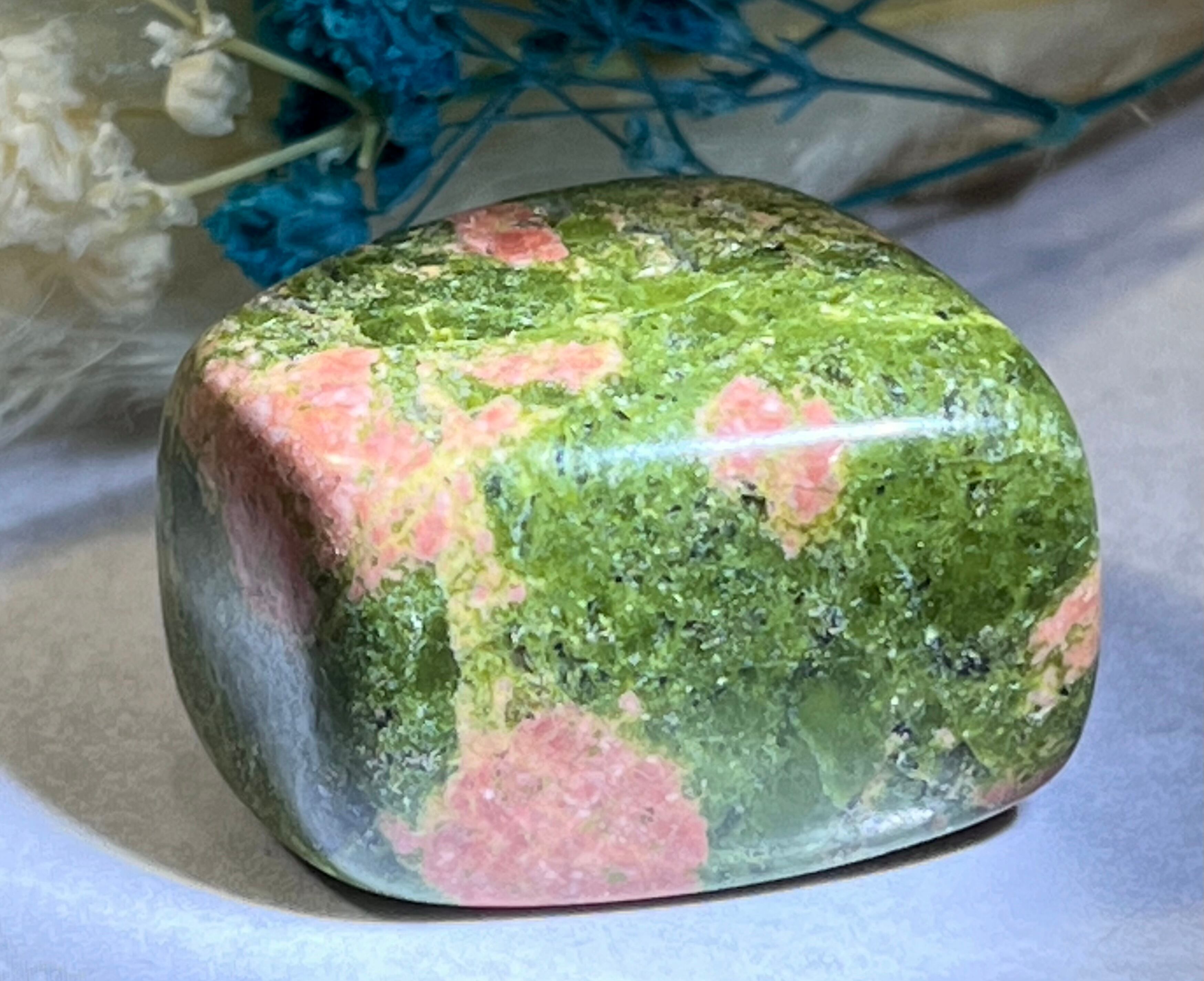 苔が生えたような緑色と咲き誇る花のようなピンク色の愛らしい組み合わせ。優しい色合いのユナカイトは、人が心に抱えているトラウマや過剰な敵対心、妬み、怒りといった負の感情を和らげてくれるとされます。