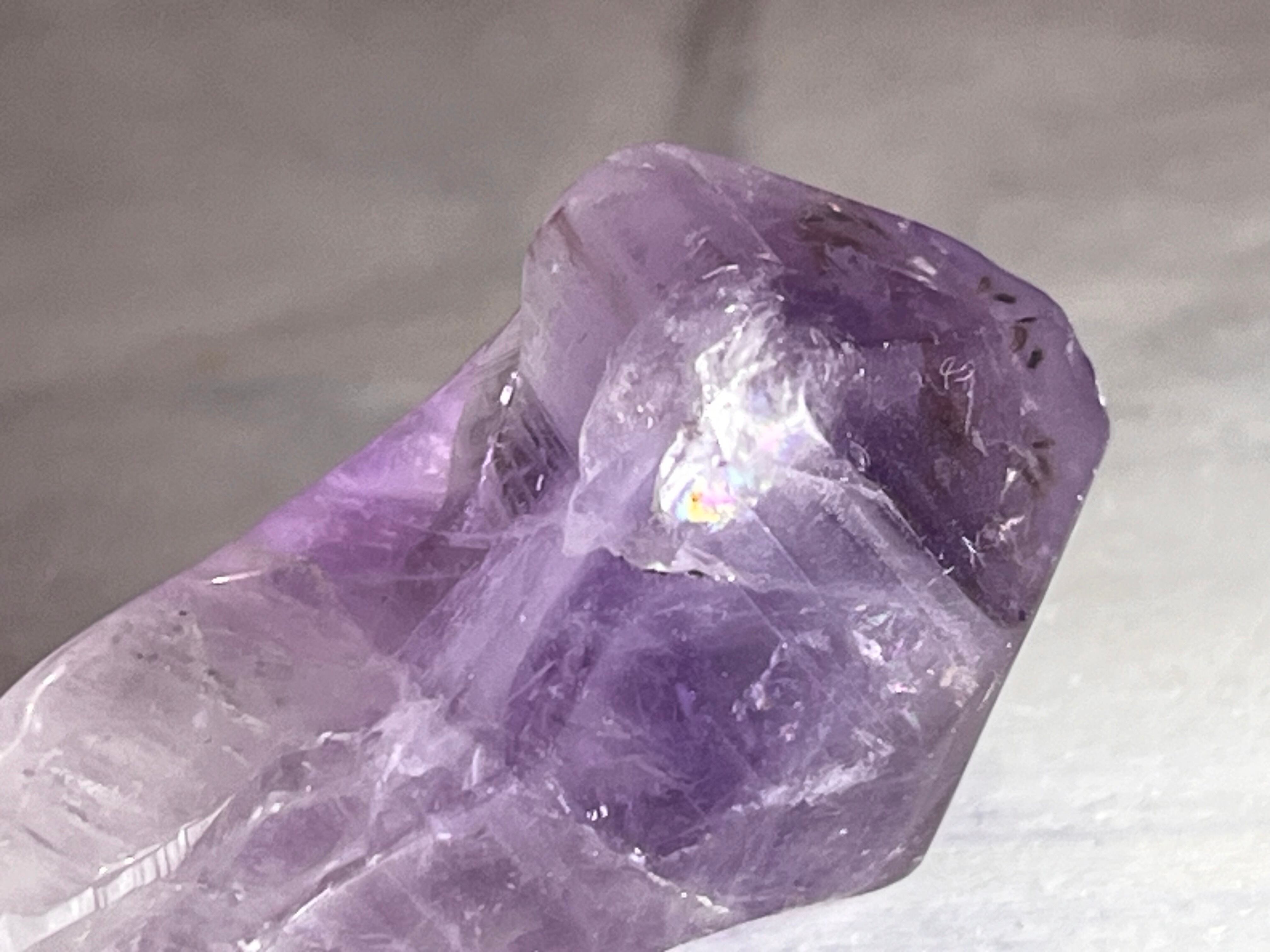 ライトを当ててあげると綺麗なレインボーが出て、金糸のようなゲーサイトも内包されたアメジストのラフストーンです✨