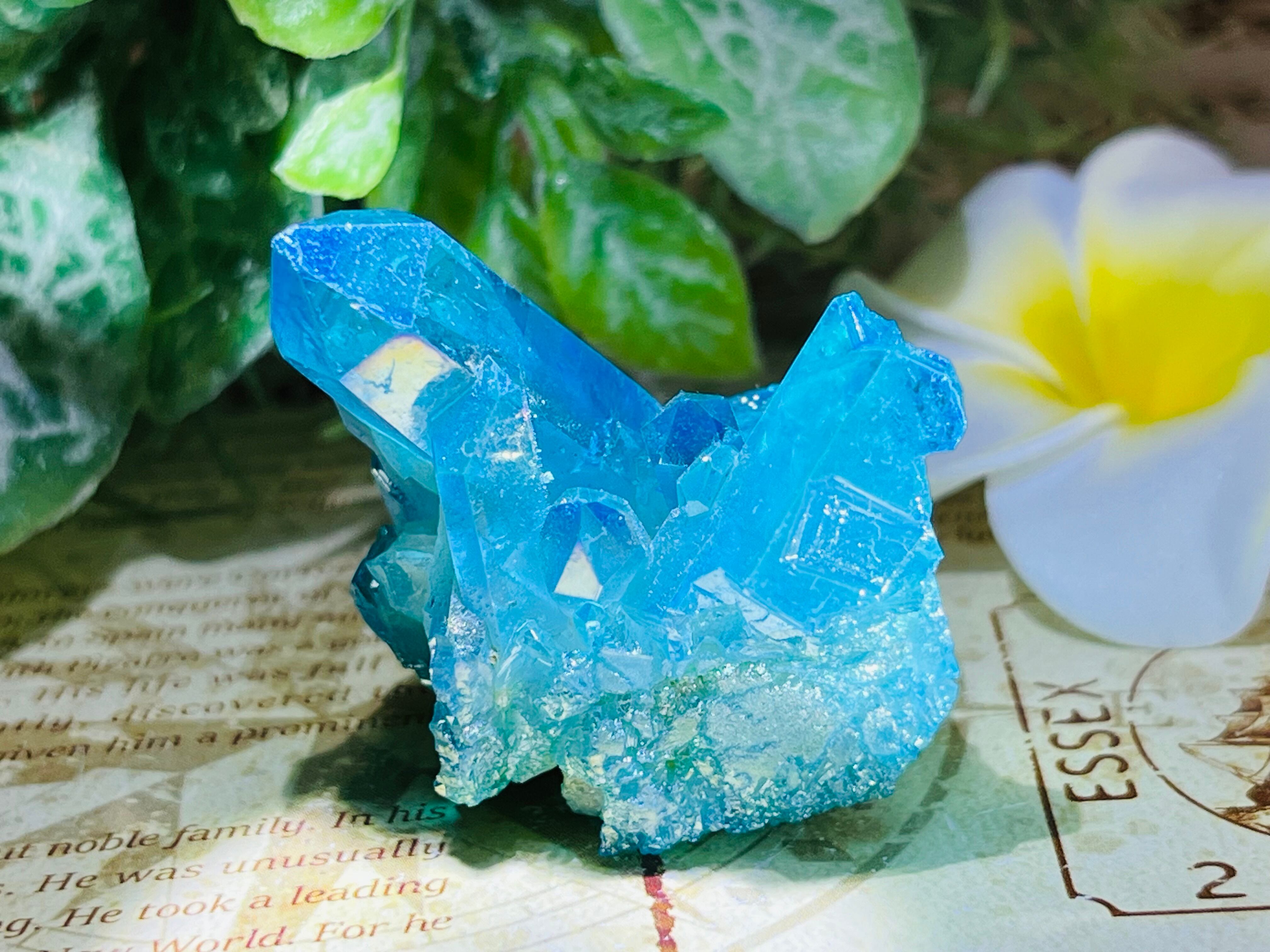 天然の水晶にイオン化した金属の蒸気を添加(蒸着)させた人工物になりますが、自然の物同士を錬金術的な組み合わせという事で、本来の水晶のパワーに上乗せし強化させてあると思われているようで、海外のヒーラーに好まれている石でもあります。