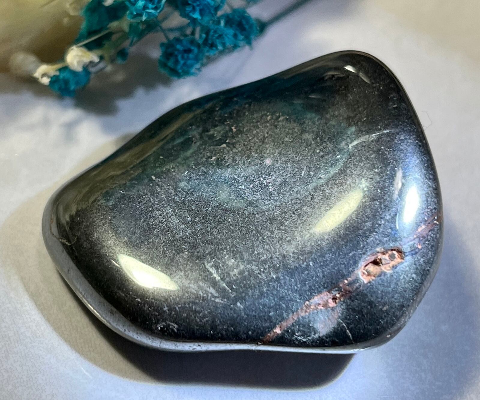 黒色の金属光沢に輝くヘマタイトのタンブルです。