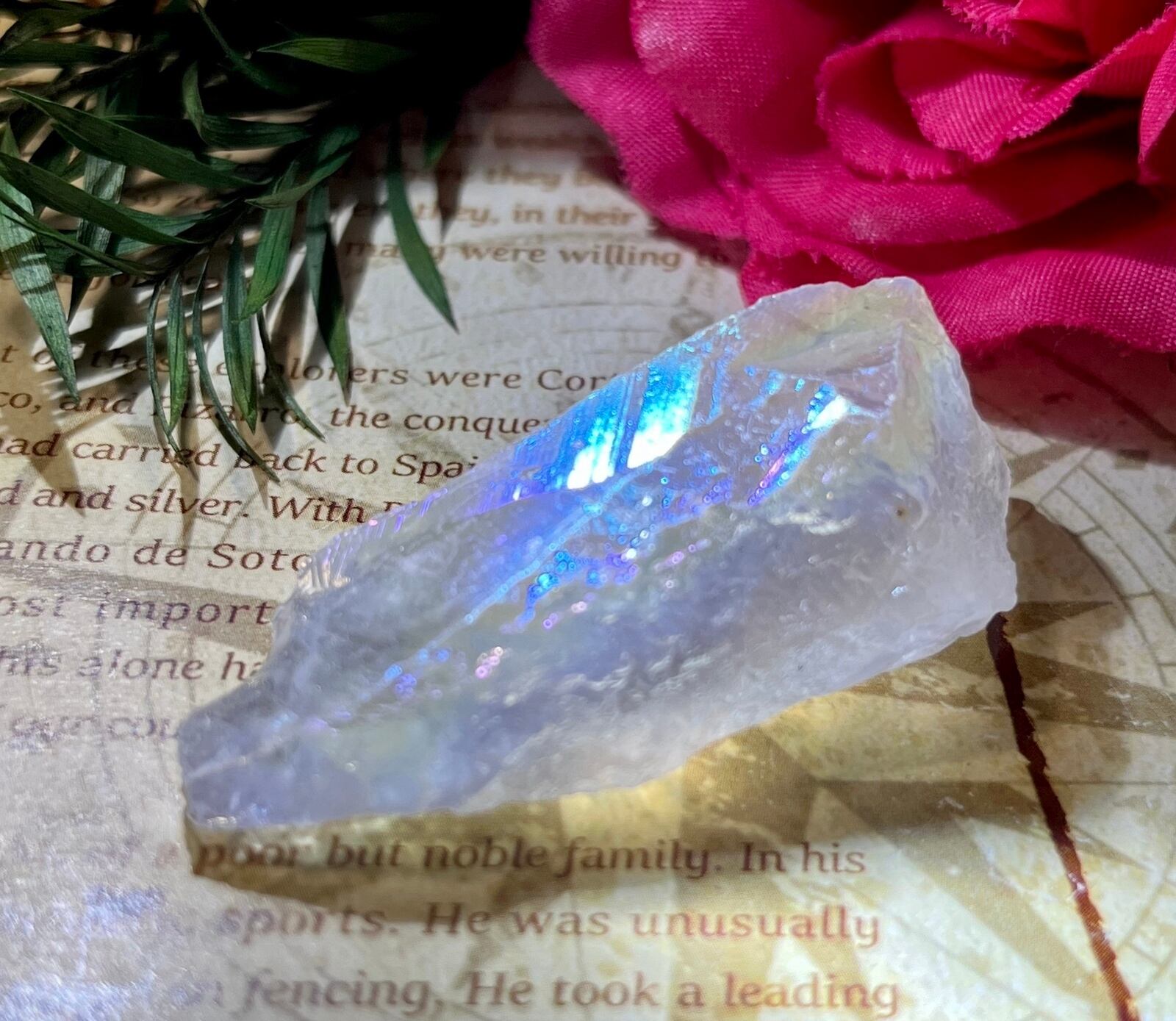 天然の水晶にイオン化した金属の蒸気を添加(蒸着)させた人工物になりますが、自然の物同士を錬金術的な組み合わせという事で、本来の水晶のパワーに上乗せし強化させてあると思われているようで、海外のヒーラーに好まれている石でもあります。