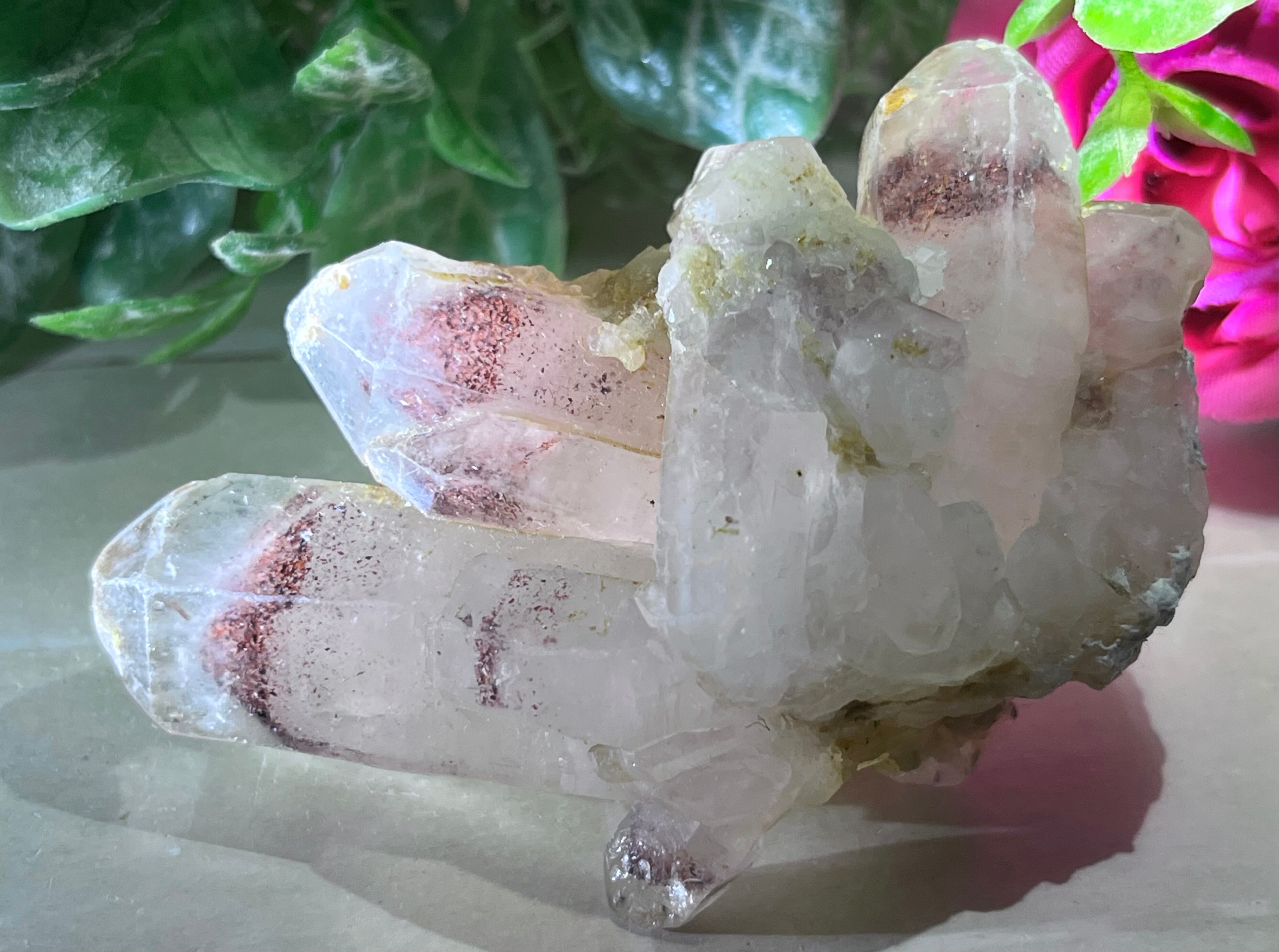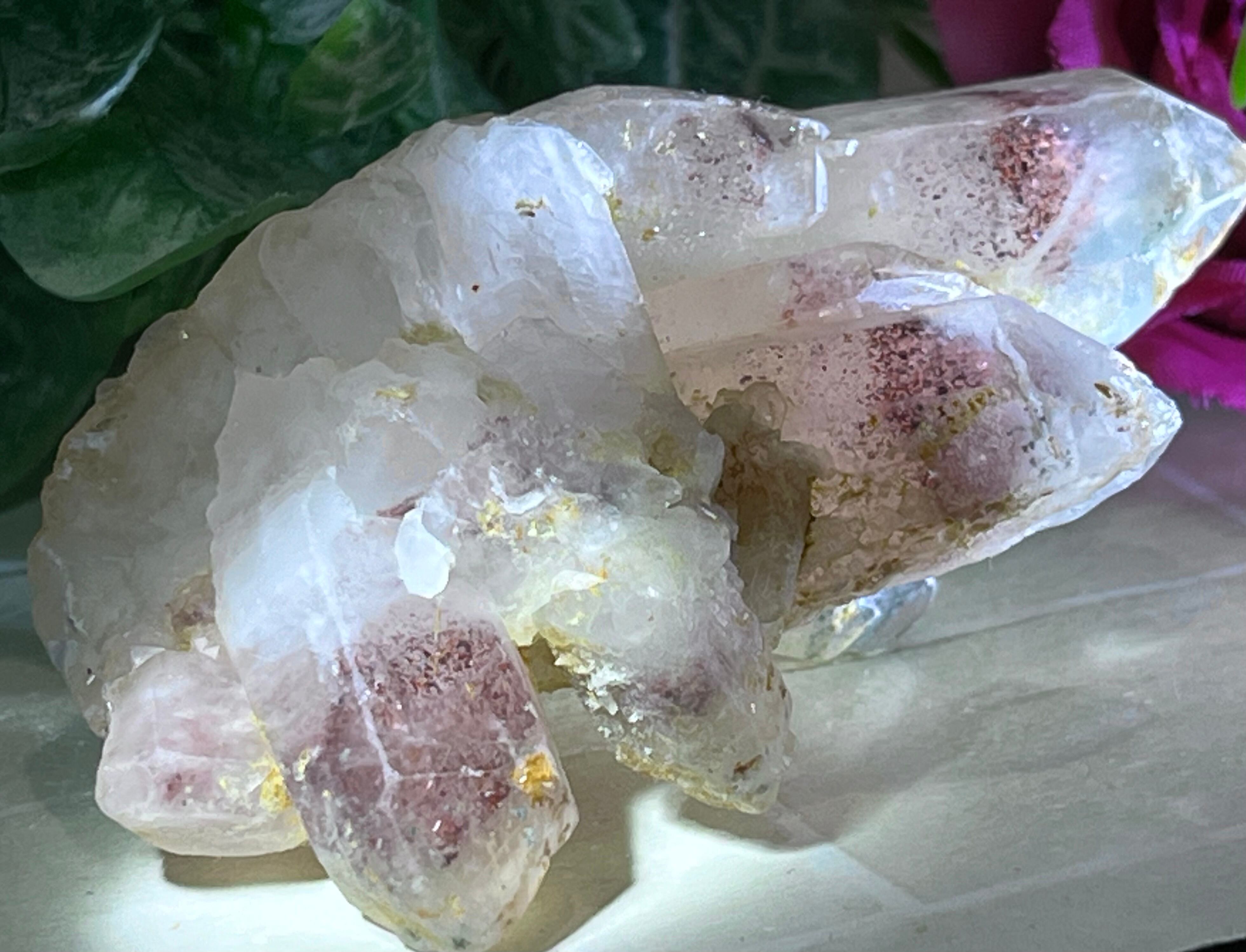 木苺のように可愛らしいストロベリークオーツのクラスターで複数の結晶にファントムの山が入っています✨