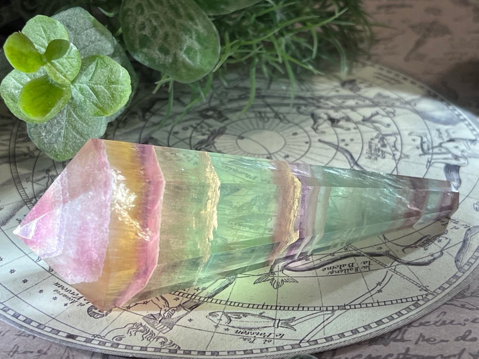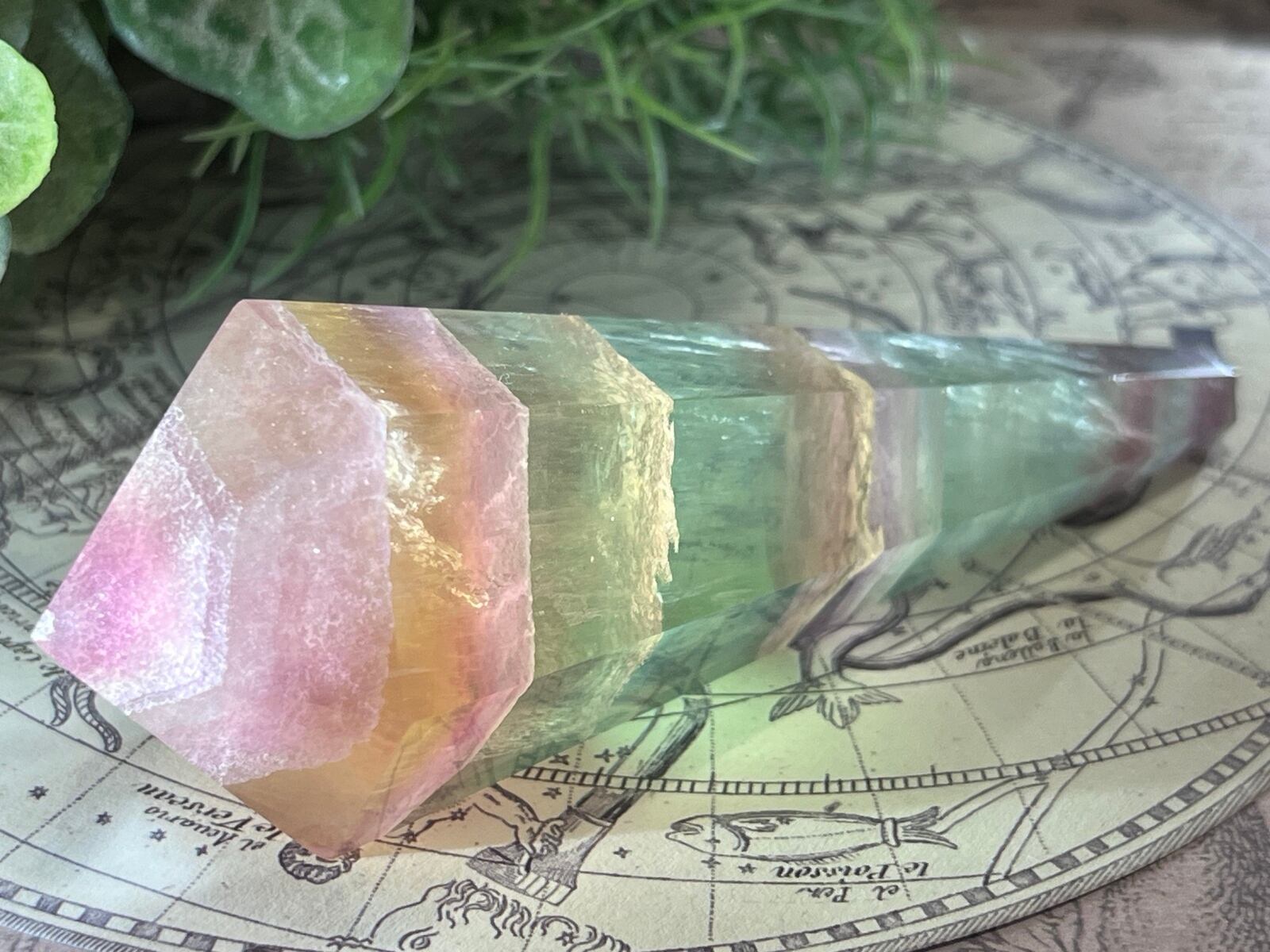エメラルドグリーンとパープル、イエローが織りなすグラデーションが美しい、マルチカラーフローライトのポイントです❁⃘*.゜