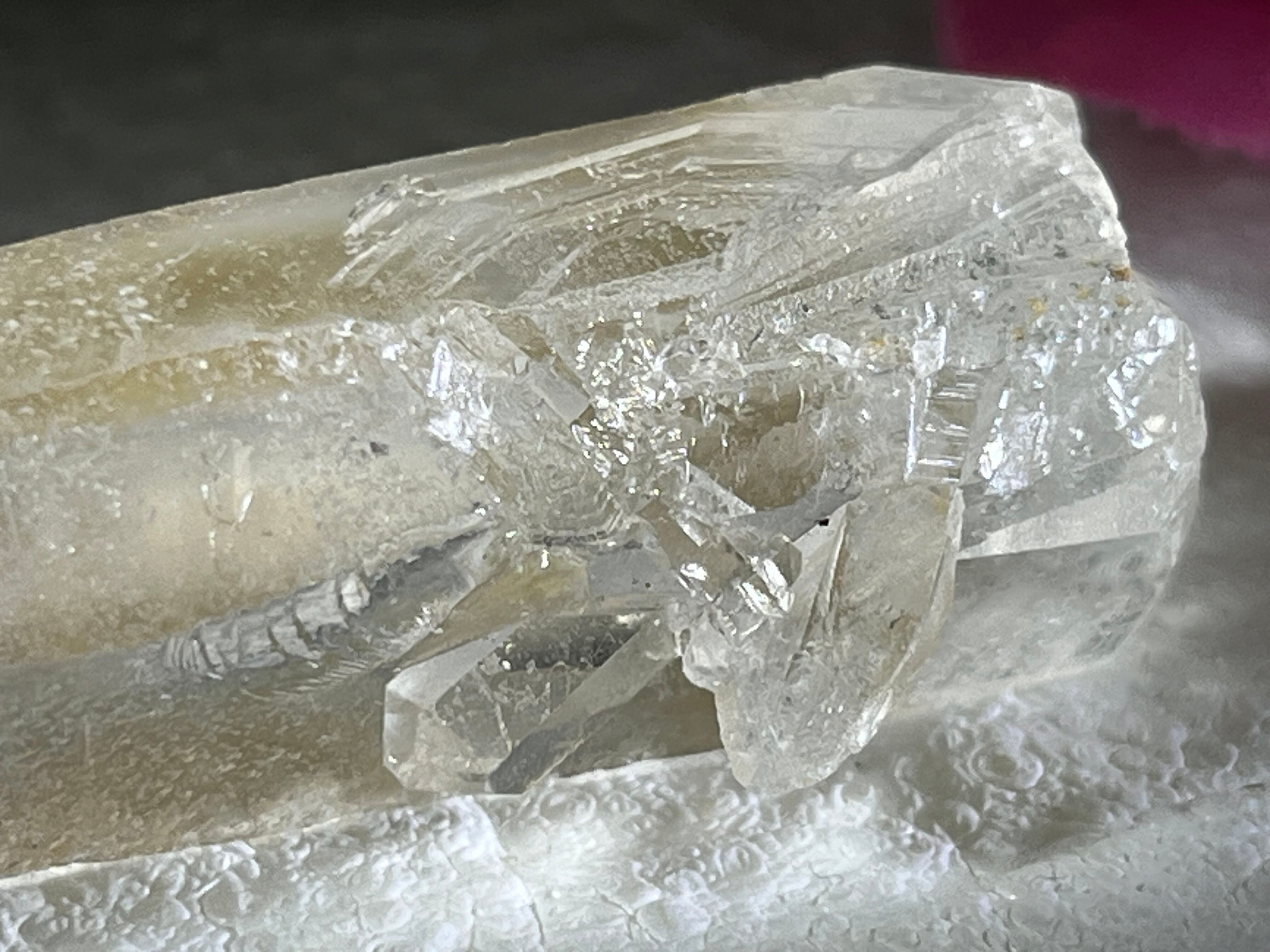 レムリアンシードクォーツには、柱面にバーコードのように見える横筋のリッジ(レムリアンリッジ)が入っており、同時にレコードキーパーと呼ばれる三角形の刻印が入っていることもあります。