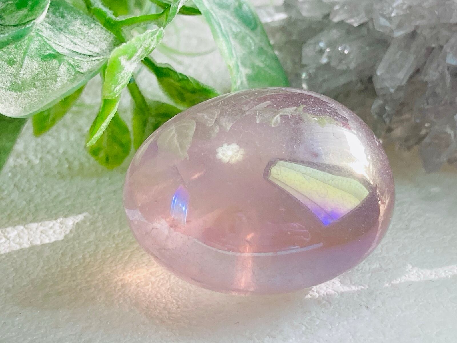 優しいミルキーピンクが七色に輝くオーラ水晶タンブルです- ̗̀꒰ঌ໒꒱ ̖́-