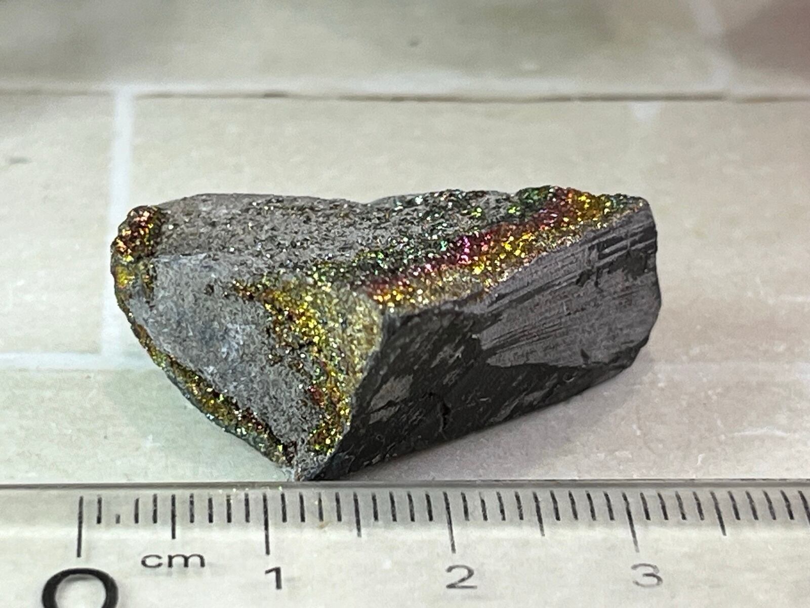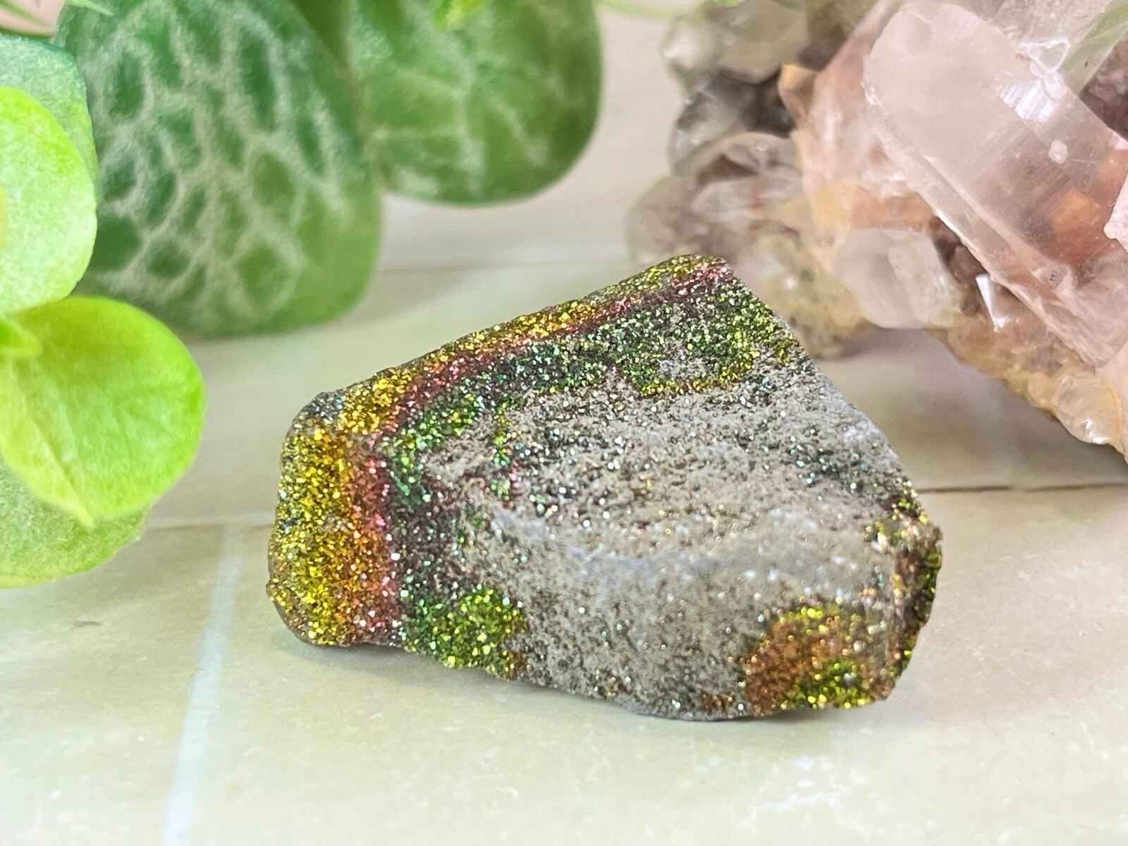 こちらはロシアのボルガ川で産出された、パイライトの微細な結晶の上にできた酸化被膜により虹色が現れた希少な原石です✨