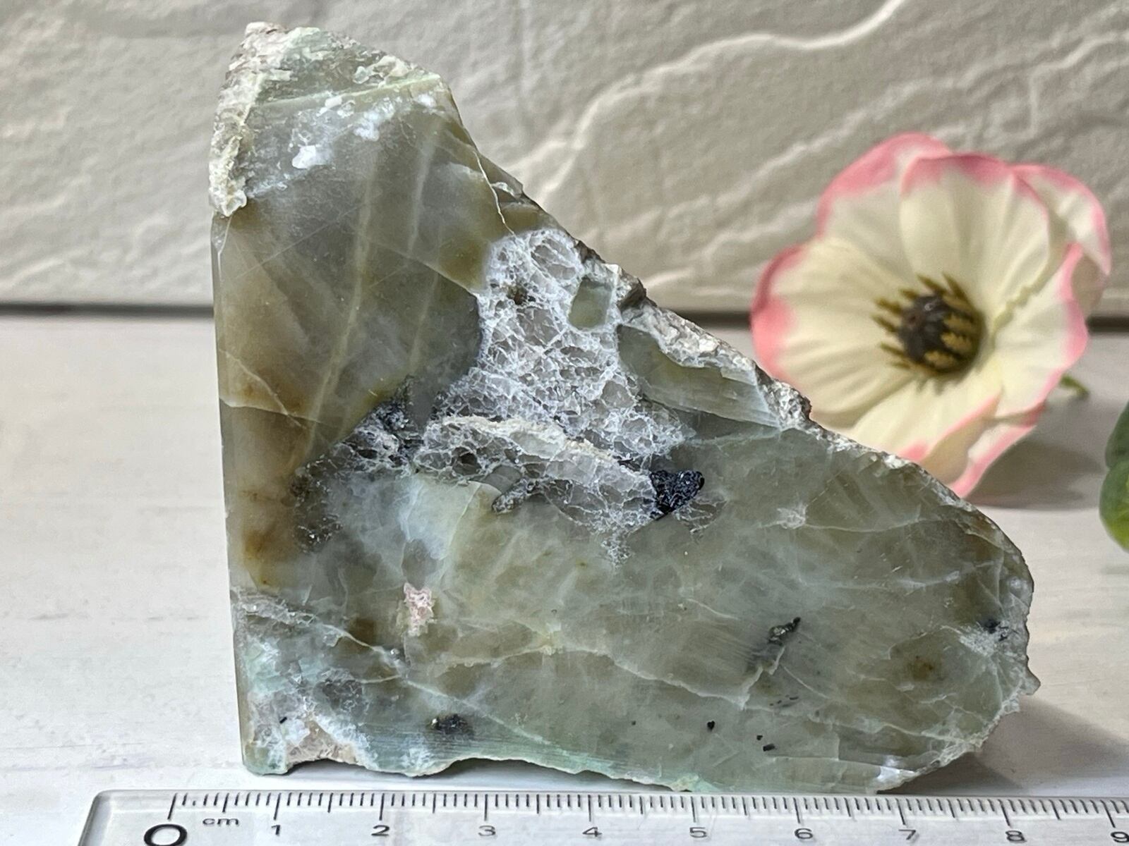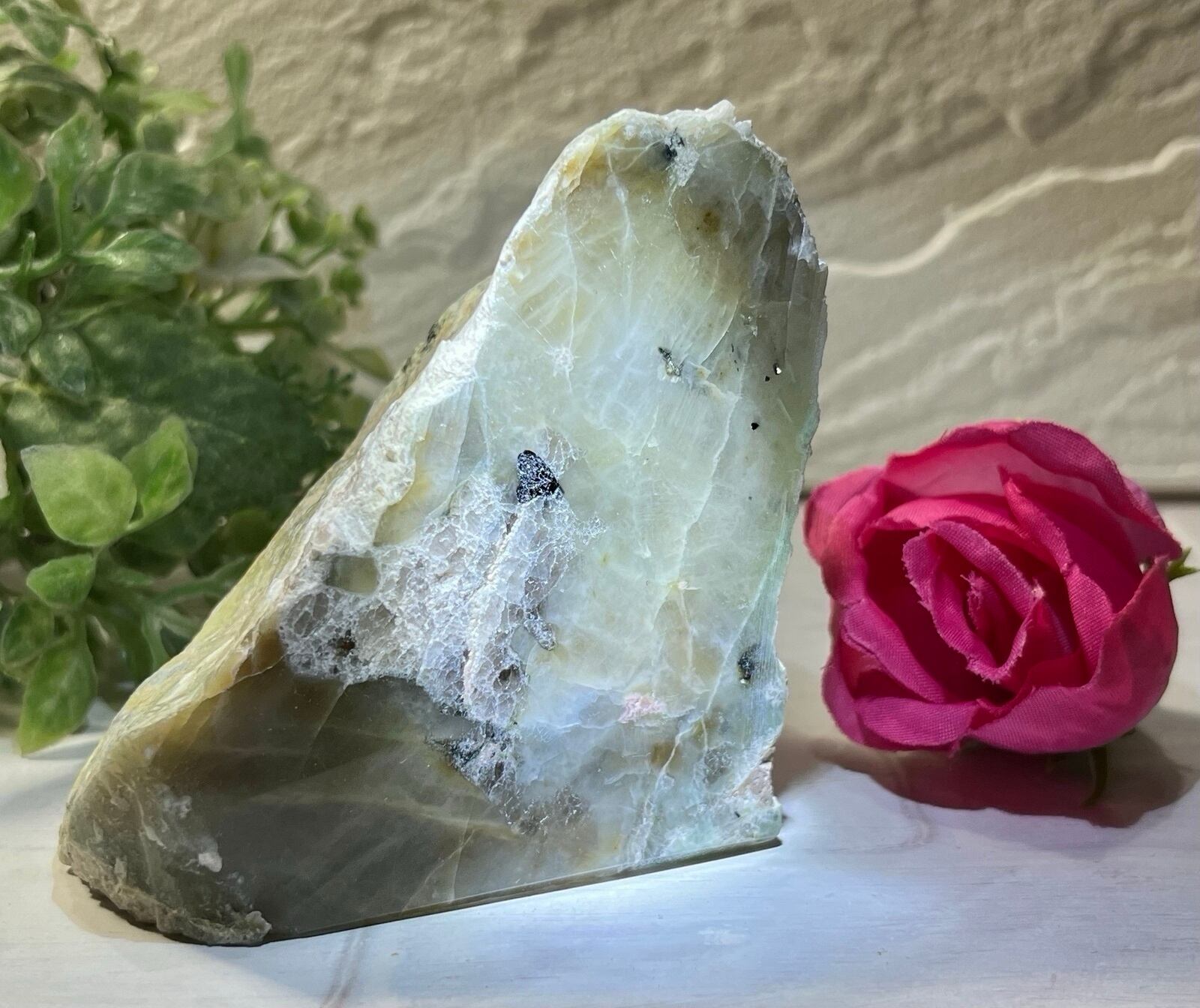 薄らとエメラルドグリーンが美しく2つの面が磨かれたグリーンムーンストーンの原石です✨