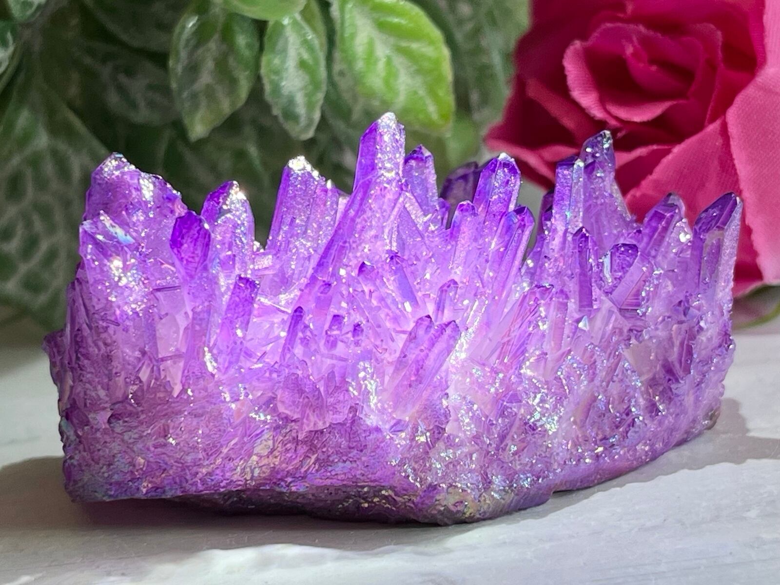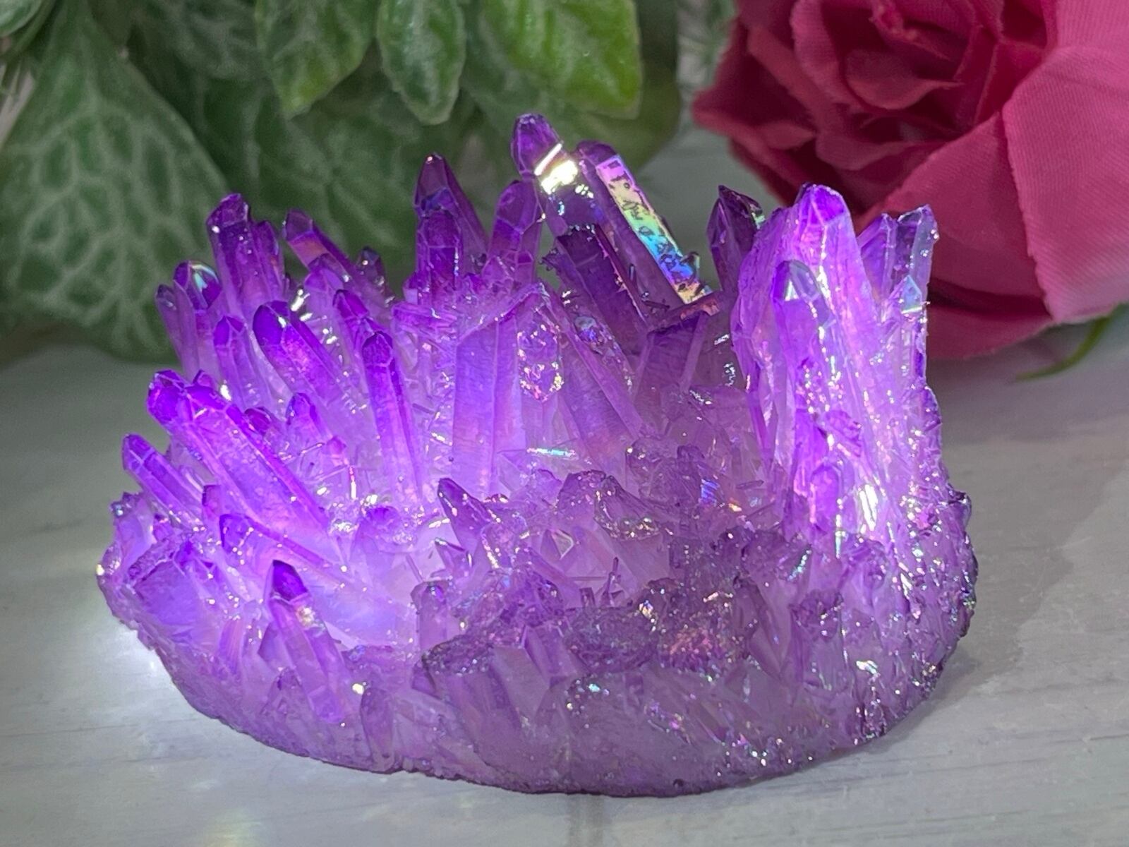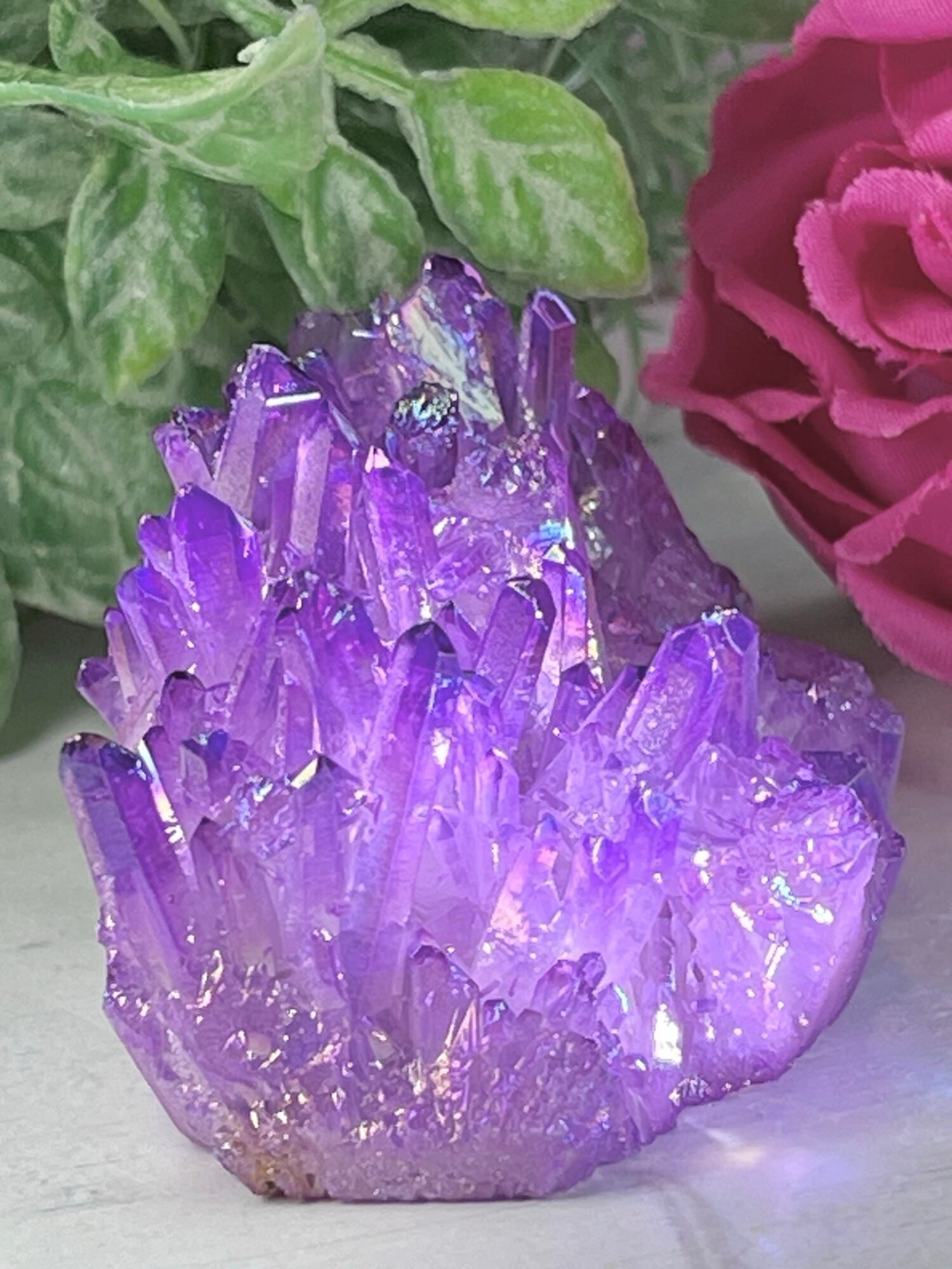オーロラのような虹色をまとったパープルのオーラ水晶クラスターです✨