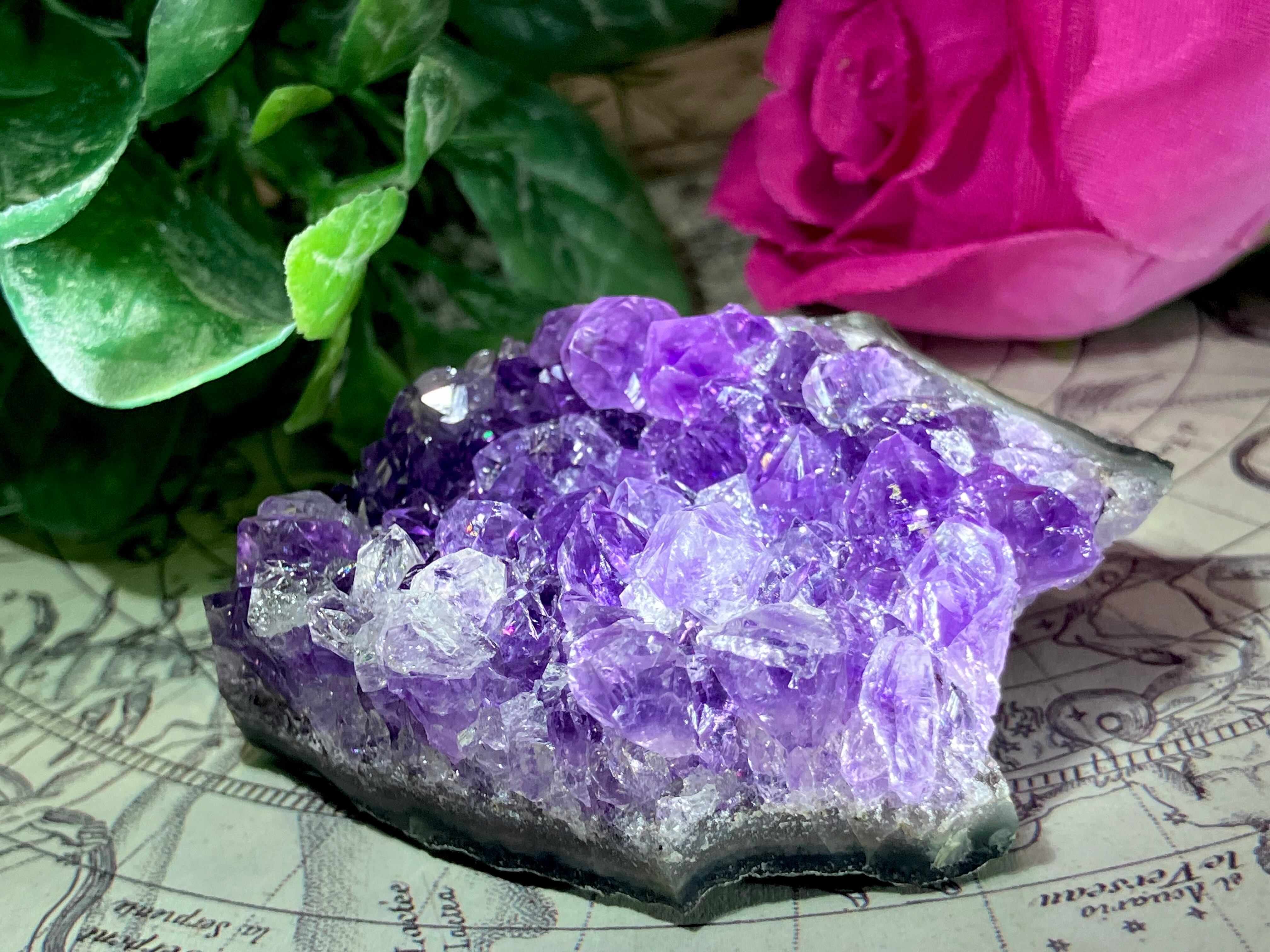 細かくて照りのある結晶がキラキラと美しいウルグアイ産アメジストのクラスターです✨
