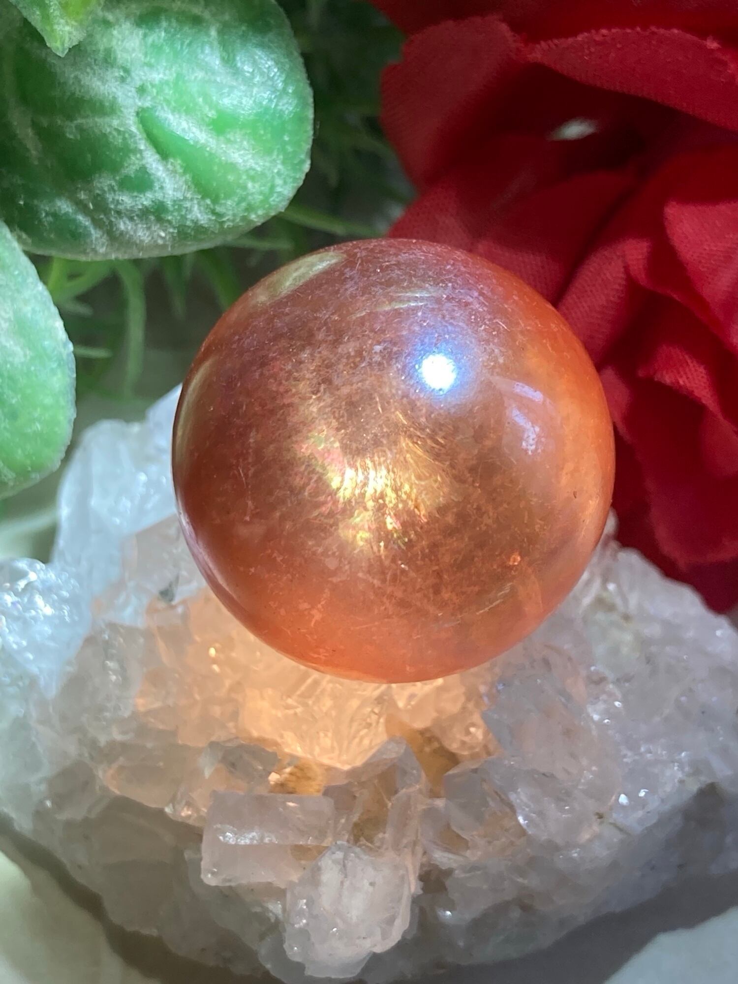 エネルギッシュなオレンジが七色に輝くオーラ水晶スフィアです- ̗̀꒰ঌ໒꒱ ̖́-