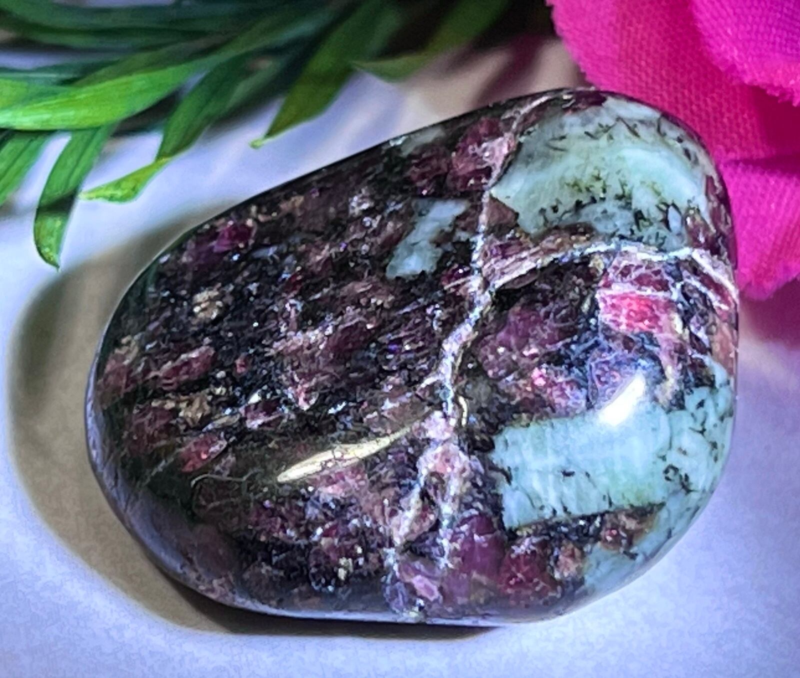 ライトを当てると綺麗に発色し自然光の下では落ち着いた色合いのレッドジルコンのタンブルです✨